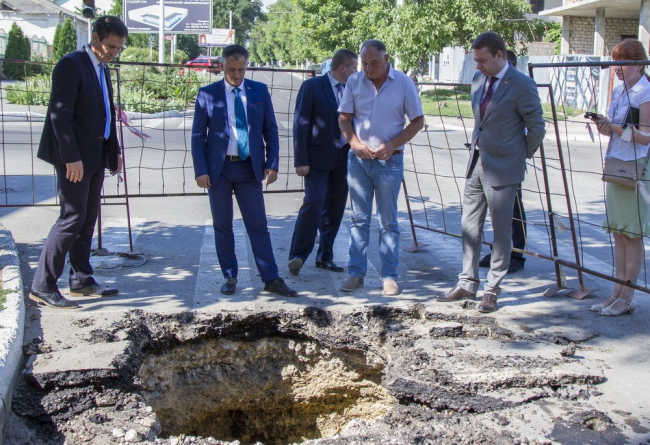Бендеры, 6 июля. /Новости Приднестровья/. Председатель Правительства Александр Мартынов вместе с главой Бендер Романом Иванченко посетили место аварии на канализационных сетях. В минувшие выходные по улице Котовского между улицами Лазо и Ленина провалился асфальт. Причина – разрушение магистрального коллектора из-за газовой коррозии трубы, сообщает пресс-служба Правительства.