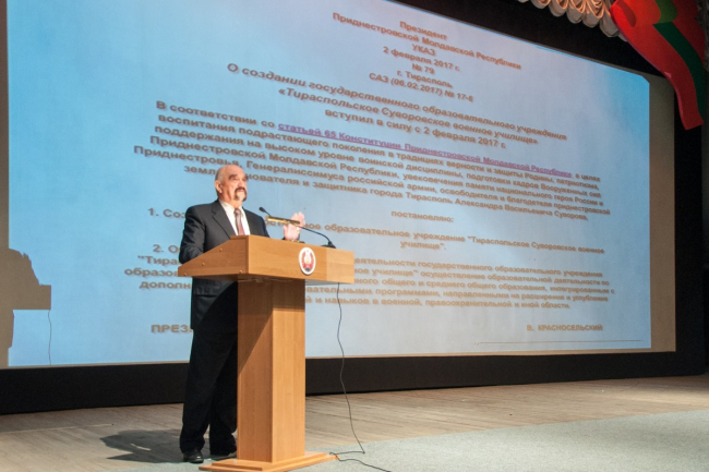 Об истории создания Суворовского военного училища России, о его роли и значении, о знаменитых суворовцах, а также о великом русском полководце, чьим именем названо учебное заведение — Александре Суворове, рассказал первый президент ПМР Игорь Смирнов.
