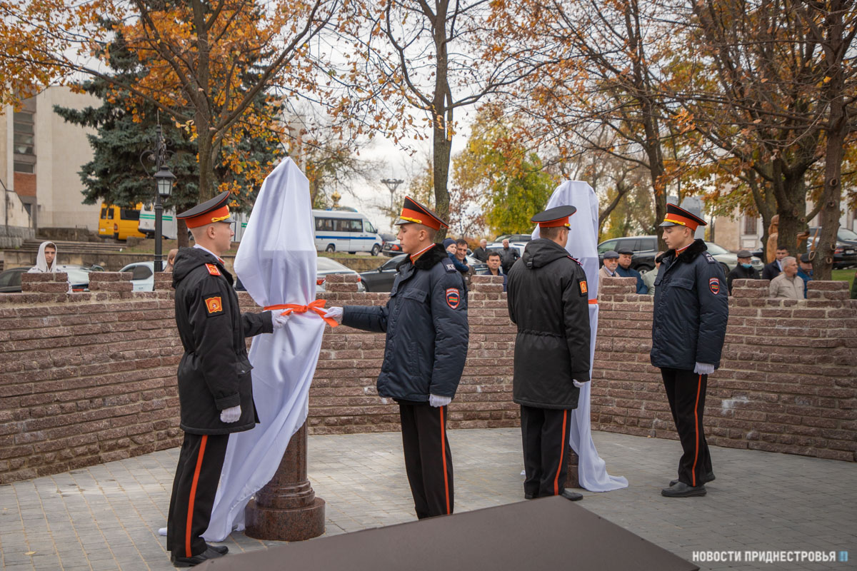 Открыли памятник суворовцы Тираспольского Суворовского военного училища и кадеты Республиканского кадетского корпуса. В завершение церемонии военнослужащие роты Почетного караула, курсанты Военного института Министерства обороны и Тираспольского юридического института МВД ПМР, а также суворовцы и кадеты прошли мимо памятных знаков торжественным маршем.