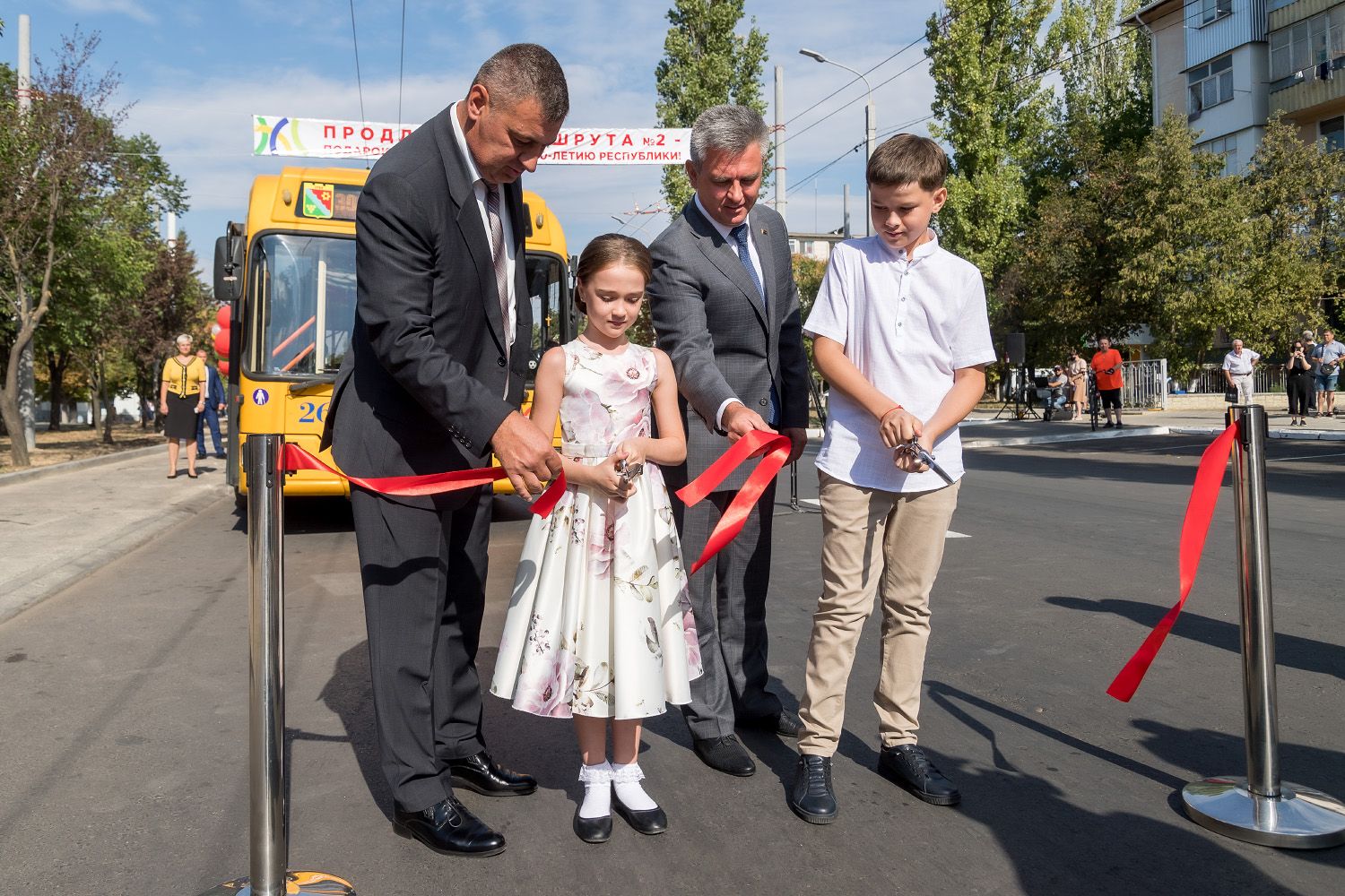 Сегодня троллейбусы № 2 совершили первый обновленный рейс. Старт их движению дали Президент, глава столичной администрации Олег Довгопол и юные жители микрорайона Октябрьский. Они разрезали символичную красную ленту и стали первыми пассажирами «двойки».