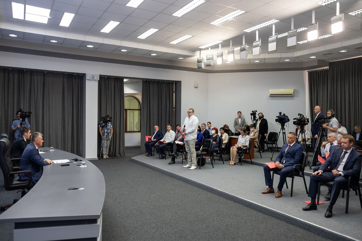 31 Авг.., 2021, 10:15Тирасполь, 31 августа. /Новости Приднестровья/. В конференц-зале Администрации Президента ПМР Вадим Красносельский общается с представителями масс-медиа. Из-за не отступившей пока еще пандемии коронавируса встреча с журналистами организована в формате, предполагающем меньшую массовость участников, говорится в сообщении президентской пресс-службы.