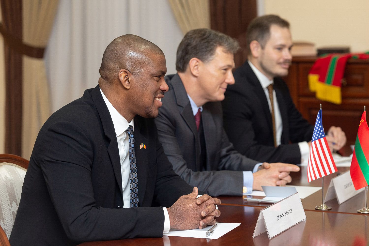 Дерек Хоган рассказал, что Тирасполь посещает впервые, но рассчитывает на продолжение активного взаимодействия, сложившегося между посольством США и приднестровской стороной. По его словам, на данный момент налажен системный диалог с приднестровским МИДом. По словам дипломата, немаловажно, что встреча с главой приднестровского государства происходит с участием Джорджа Кента – переговорщика от США. Говоря о цели визита делегации, Дерек Хоган отметил, что хочет узнать о приднестровской позиции по ряду актуальных вопросов.