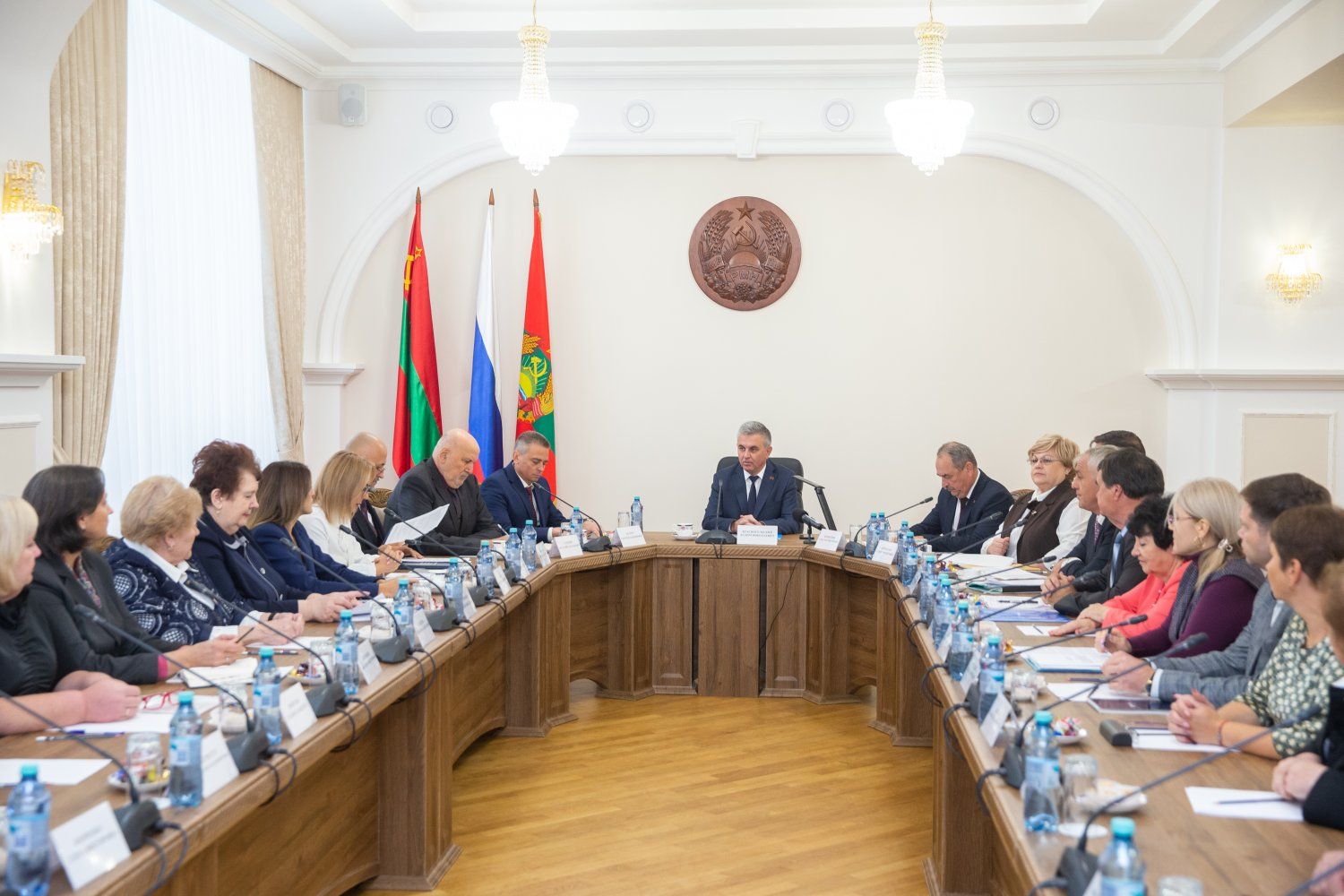 Тирасполь, 17 октября. /Новости Приднестровья/. Президент ПМР Вадим Красносельский провел расширенную встречу с руководством Федерации профсоюзов Приднестровья, отраслевых и территориальных объединений, первичных профсоюзных ячеек крупных предприятий и организаций республики. Информационно-дискуссионное мероприятие прошло в Доме официальных приемов Администрации Президента ПМР.