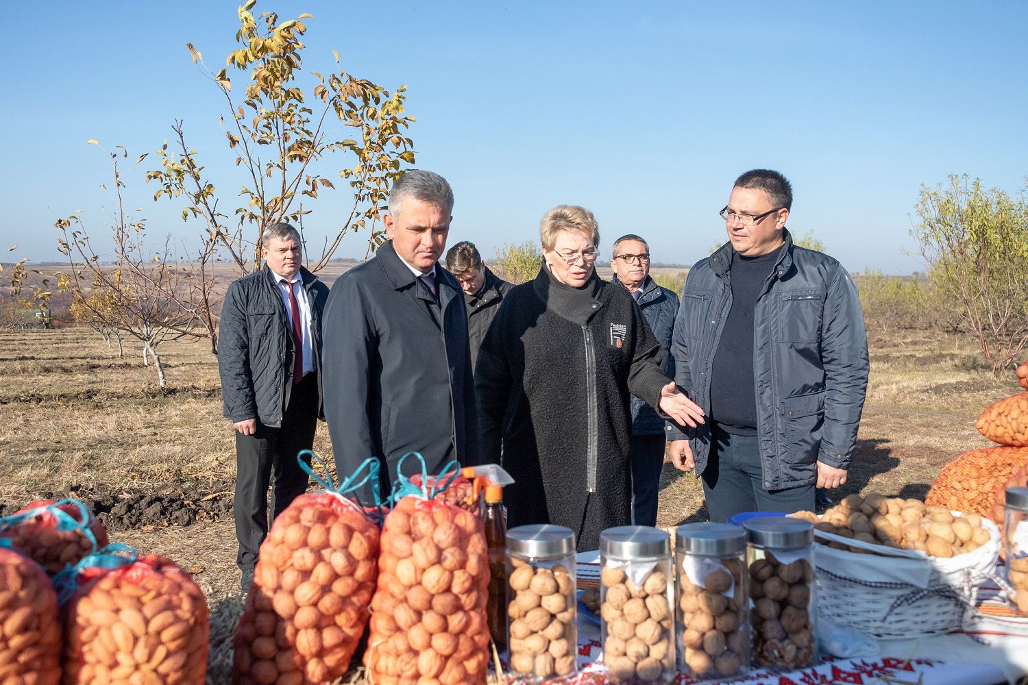 Начинали впятером, сейчас коллектив вырос в пять раз. Площадь обрабатываемых земель – порядка 300 гектаров. Выращивают в основном технические культуры, не требующие полива. За счет них удается сохранять рентабельность предприятия и вкладывать средства в развитие новых направлений. Особая гордость аграриев – ореховый и миндальный сады (площадью 10 и 16 гектаров соответственно). Вадим Красносельский бывал здесь на второй год после закладки миндального сада. Тогда только делали прогнозы. В этот визит уже можно говорить об урожайности.