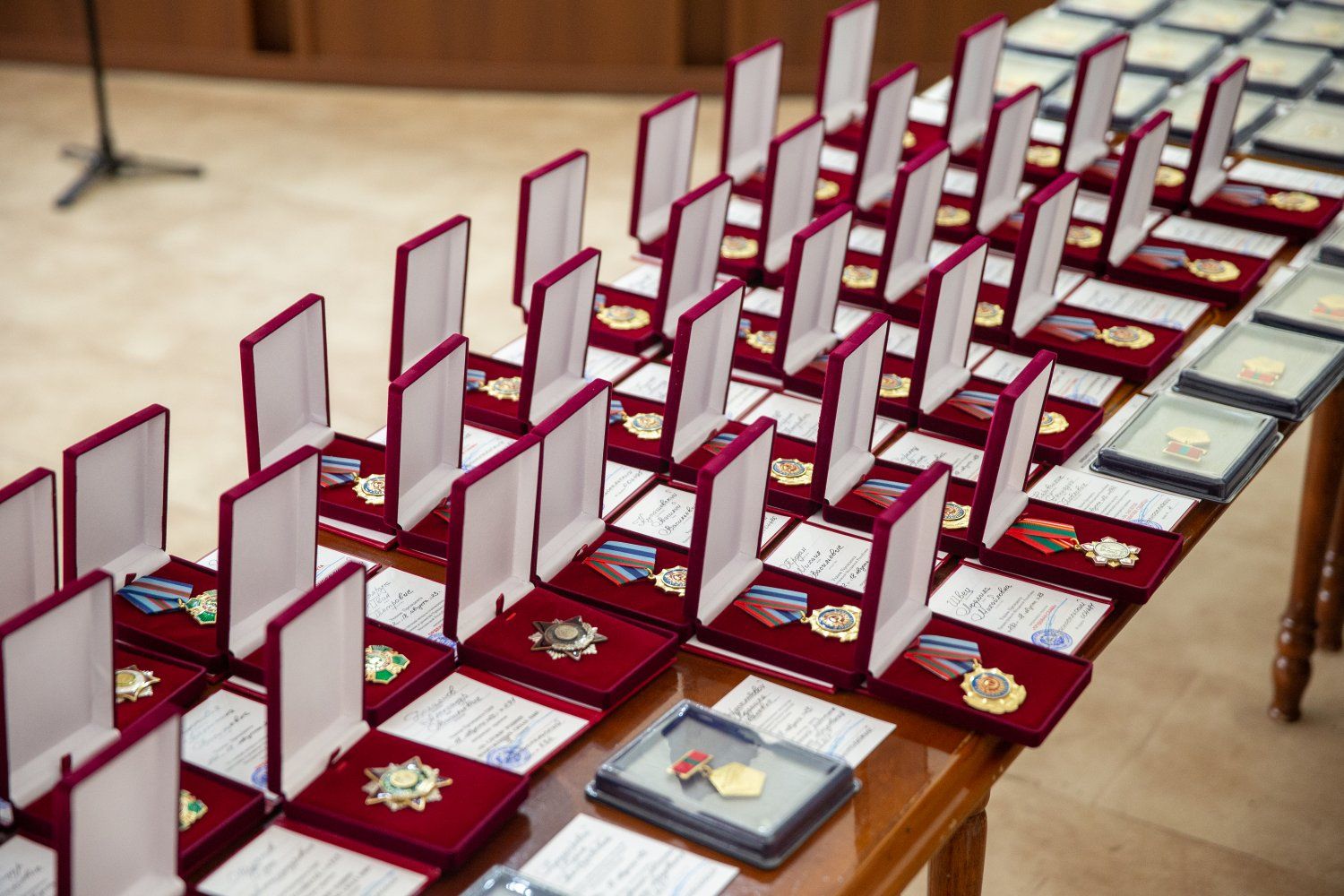 Тирасполь, 31 августа. /Новости Приднестровья/. Сегодня в Тирасполе прошла торжественная церемония вручения государственных наград. По случаю приближающейся 33-й годовщины со дня образования Приднестровской Молдавской Республики первые лица страны вручили достойнейшим приднестровцам 45 орденов и четыре десятка документов о присвоении званий. Церемония проходила в малом зале Дворца Республики.
