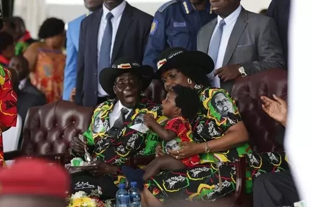 Мугабе надел на праздник костюм, украшенный собственными изображениями и партийными цветами, а его жена Грейс, которую считают возможной преемницей президента, имела похожий наряд.