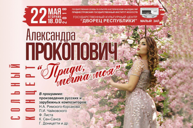 Тирасполь, 17 мая. /Новости Приднестровья/. Во вторник, 22 мая, в малом зале Дворца Республики состоится сольный концерт оперной певицы Александры Прокопович.