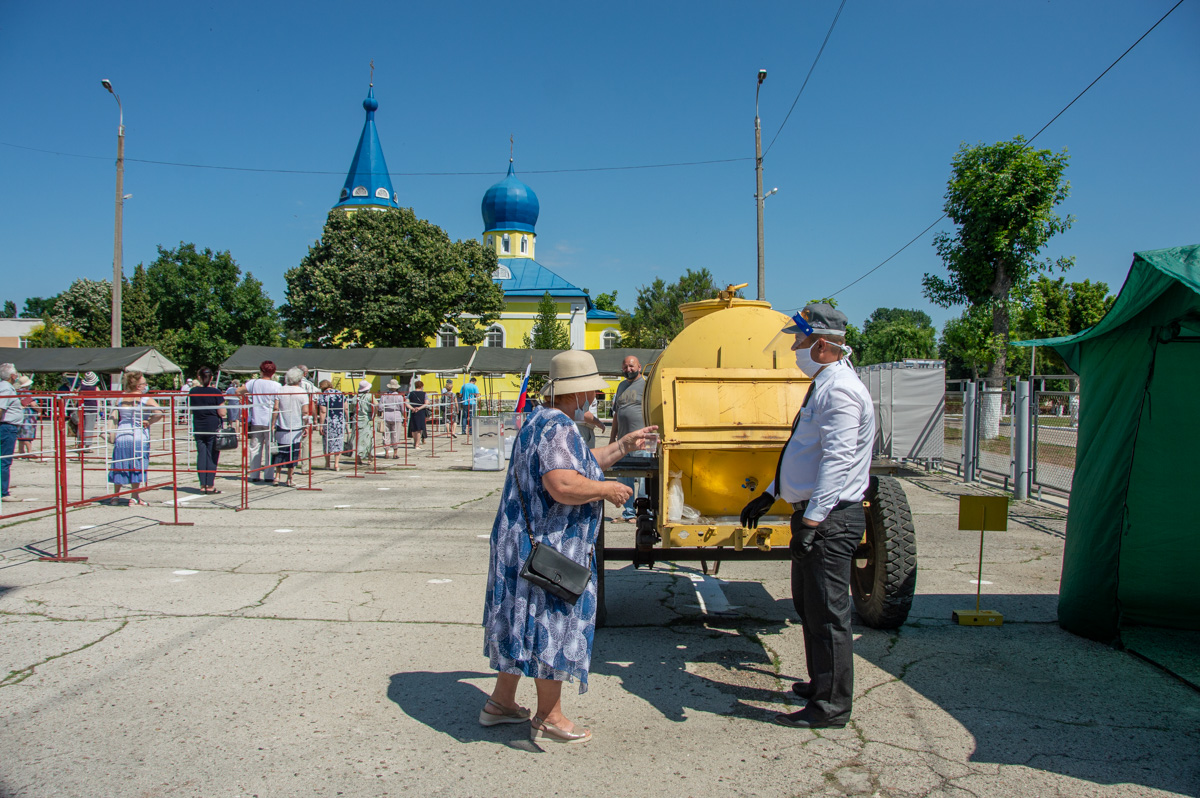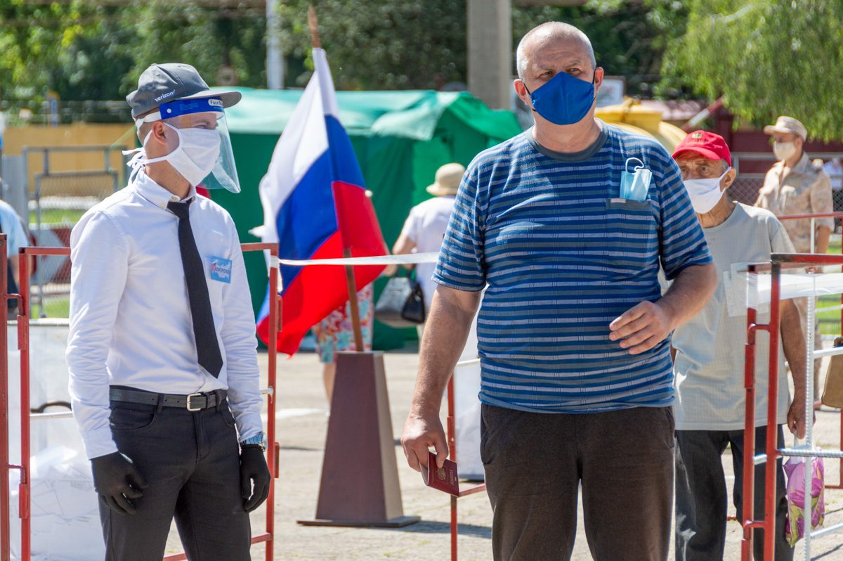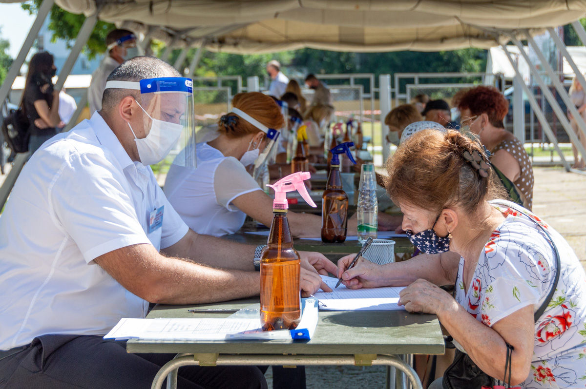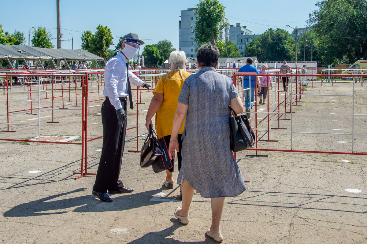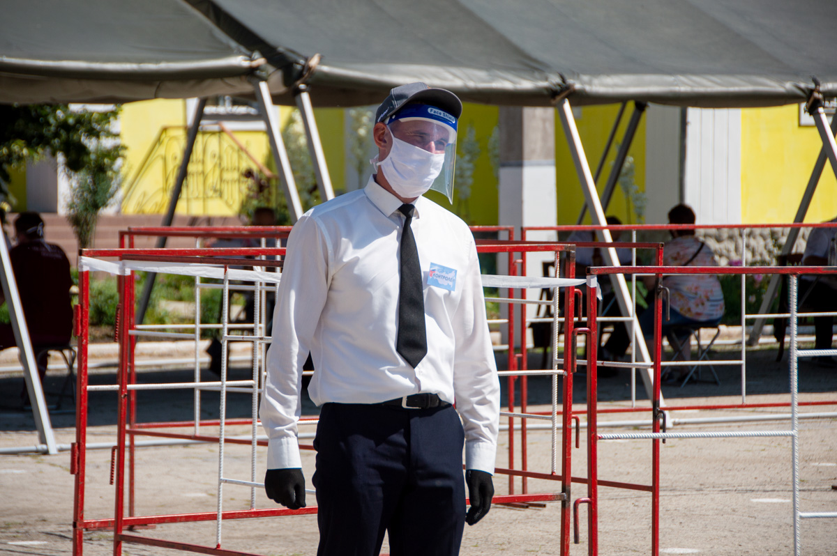 Из-за коронавируса – усиленные меры безопасности как на входе в воинскую часть, так и на самой территории. Помимо традиционных антисептиков, разделение очередей как в аэропорту и обязательная дистанция. Ещё один нюанс голосования в эпоху пандемии – члены избирательной комиссии работают на улице и тоже на расстоянии. Итого – длинная шеренга из 16 столиков. У каждого пришедшего проверяют документы и выдают бюллетень.