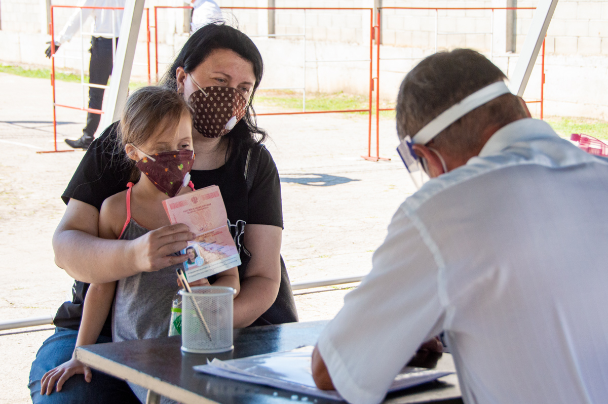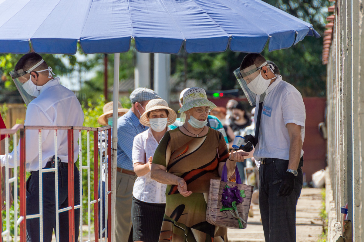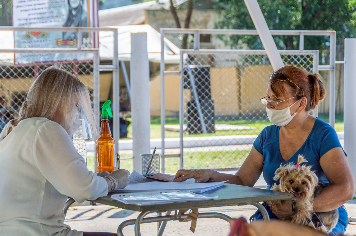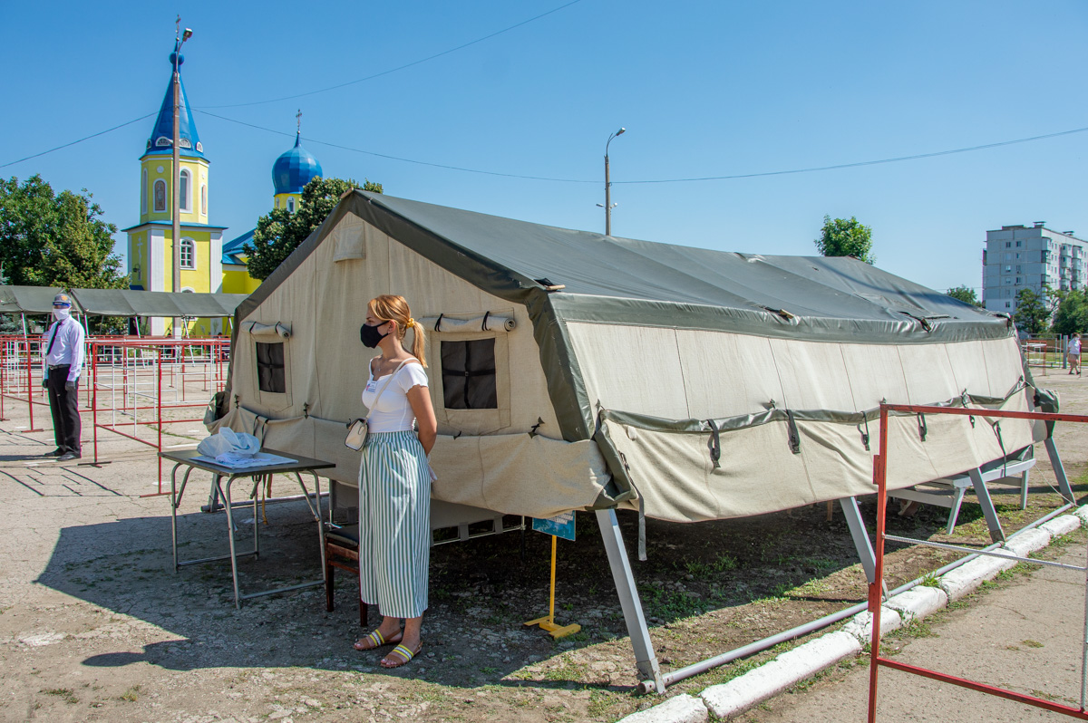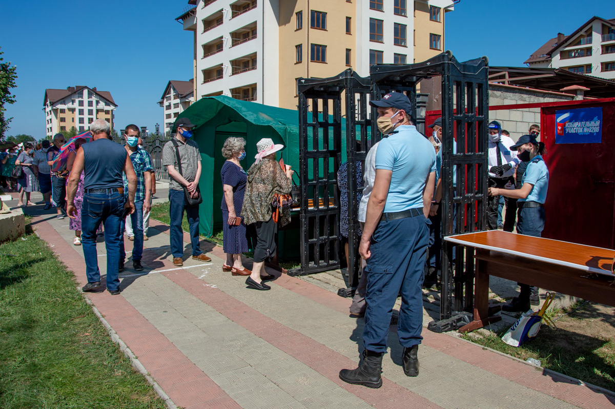 Из-за коронавируса – усиленные меры безопасности как на входе в воинскую часть, так и на самой территории. Помимо традиционных антисептиков, разделение очередей как в аэропорту и обязательная дистанция. Ещё один нюанс голосования в эпоху пандемии – члены избирательной комиссии работают на улице и тоже на расстоянии. Итого – длинная шеренга из 16 столиков. У каждого пришедшего проверяют документы и выдают бюллетень.