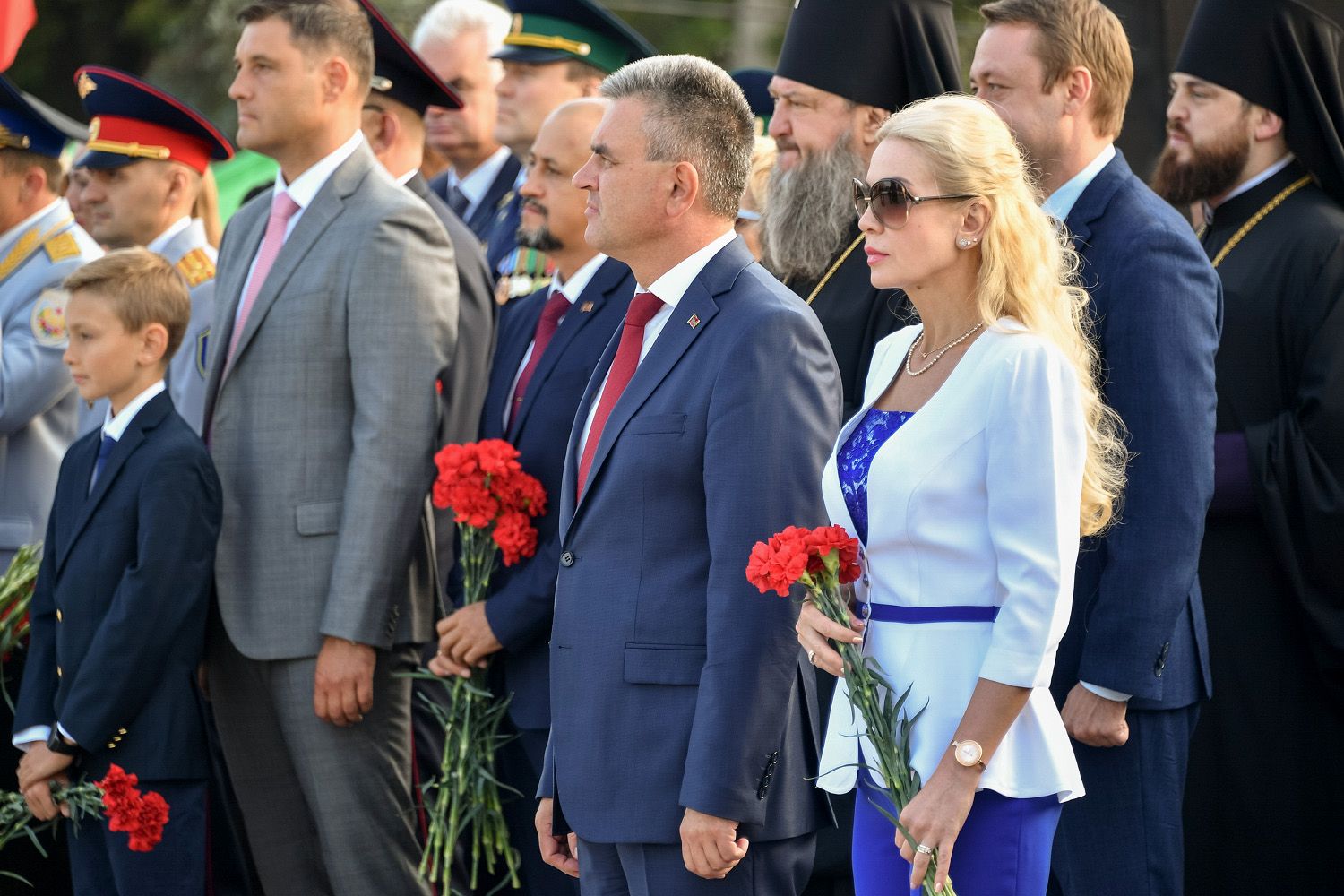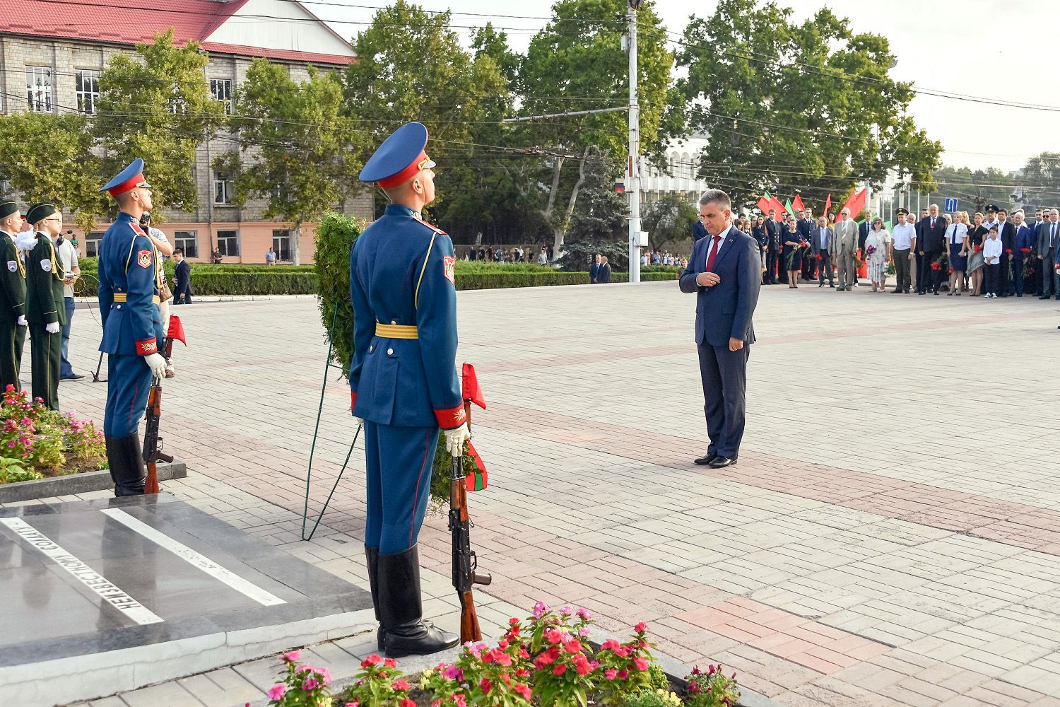 Под звуки метронома головы склонили Президент ПМР с супругой, руководители и представители органов государственной власти, члены зарубежных делегаций, прибывшие на празднование главного государственного праздника Приднестровья, духовенство, военнослужащие, общественность.