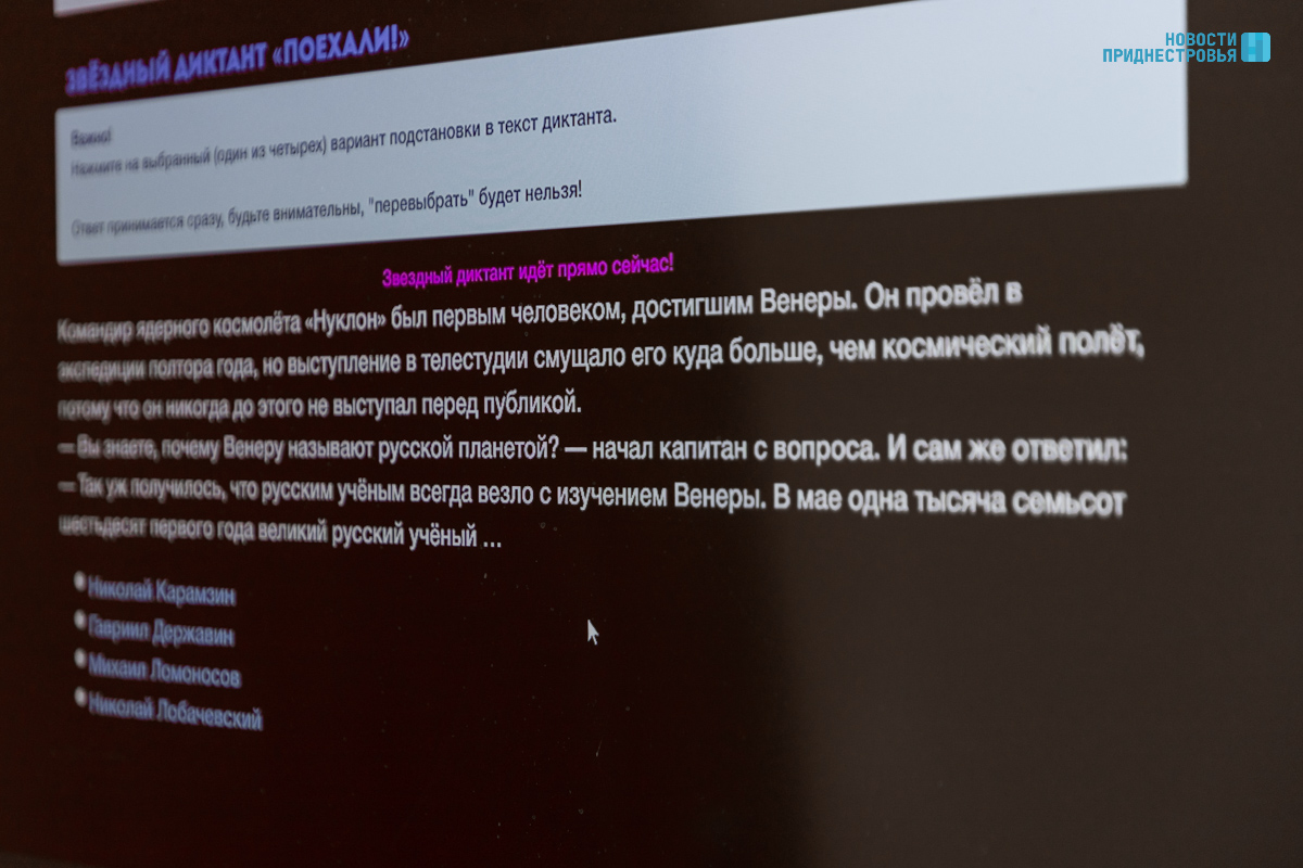 Тирасполь, 12 апреля. /Новости Приднестровья/. Приднестровцы присоединились к звёздному диктанту. Вместе с другими участниками проекта под знаменитое «Поехали!» они слушали текст знаменитого российского писателя Сергея Лукьяненко и выполняли задания.