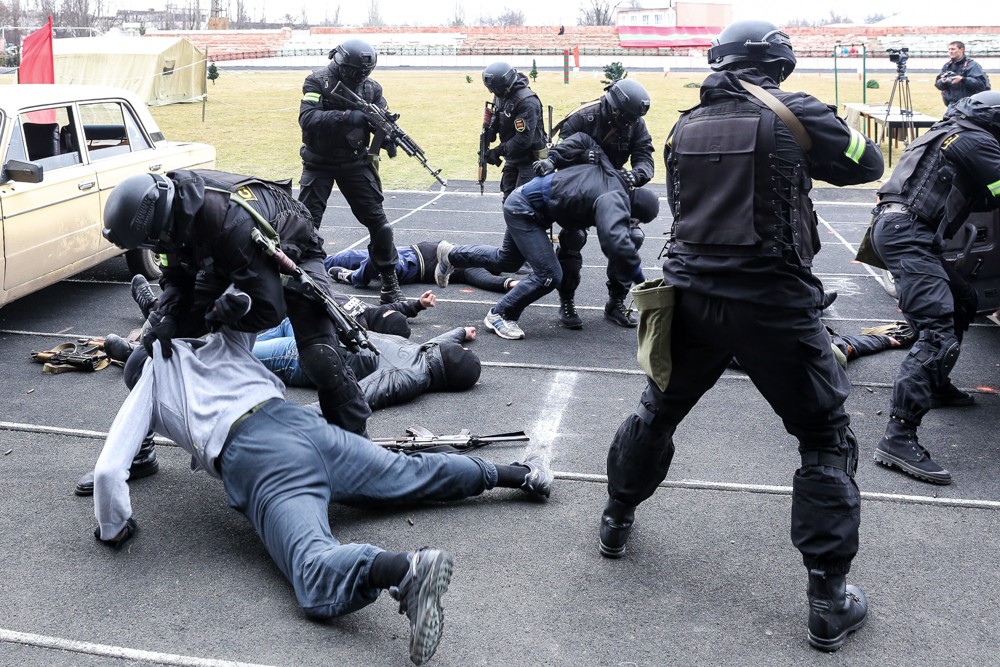 Финалом показательных выступлений стала сцена: преступники в масках грабят инкассатора и пытаются на двух автомобилях скрыться; за ними начинается погоня; разыгрывается комбинация, в результате которой «преступники оказываются зажатыми между двумя милицейскими кордонами; длительная перестрелка заканчивается только после того, как спецназ, прикрываясь пуленепробиваемыми щитами, буквально продавливает линию огня и вынуждает «преступников» сдаться.