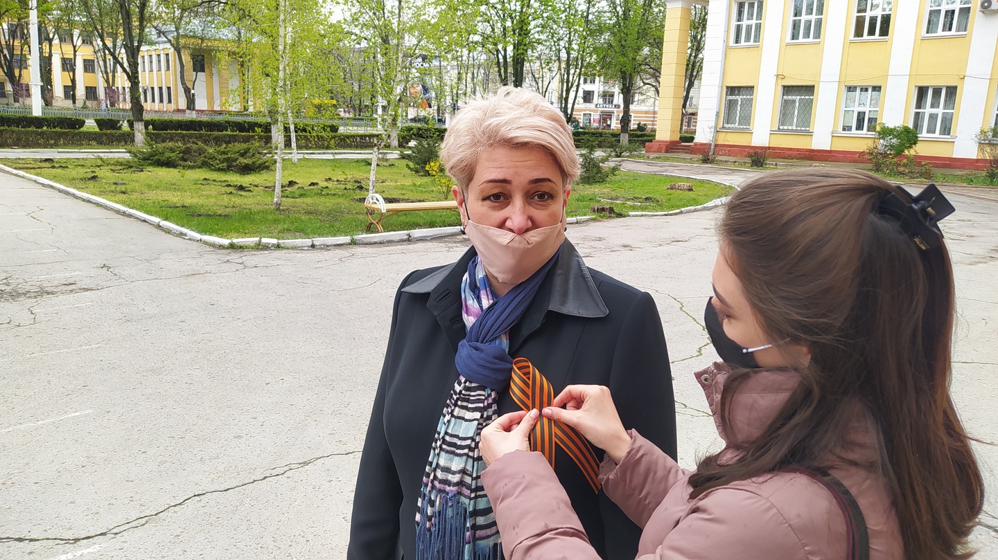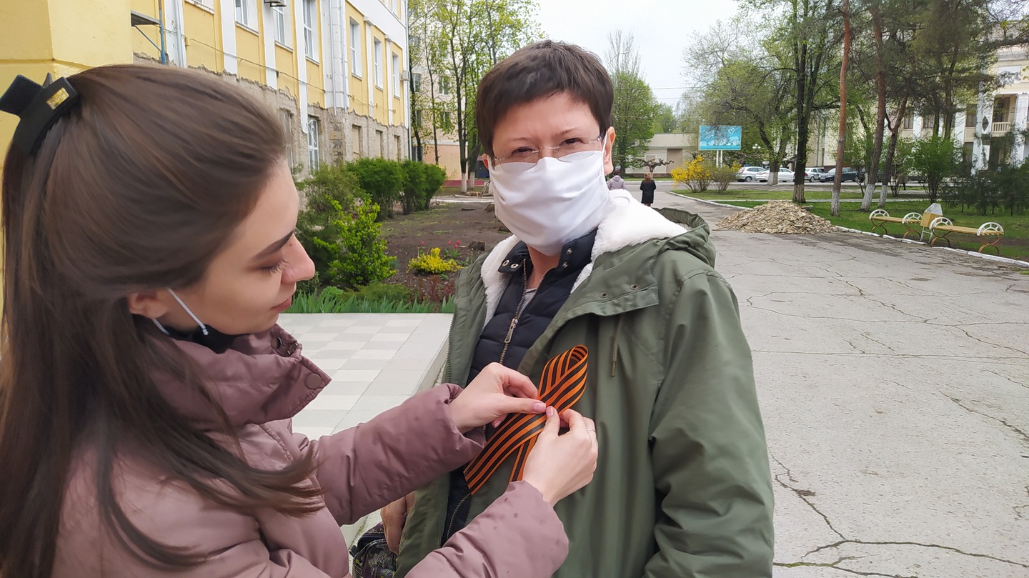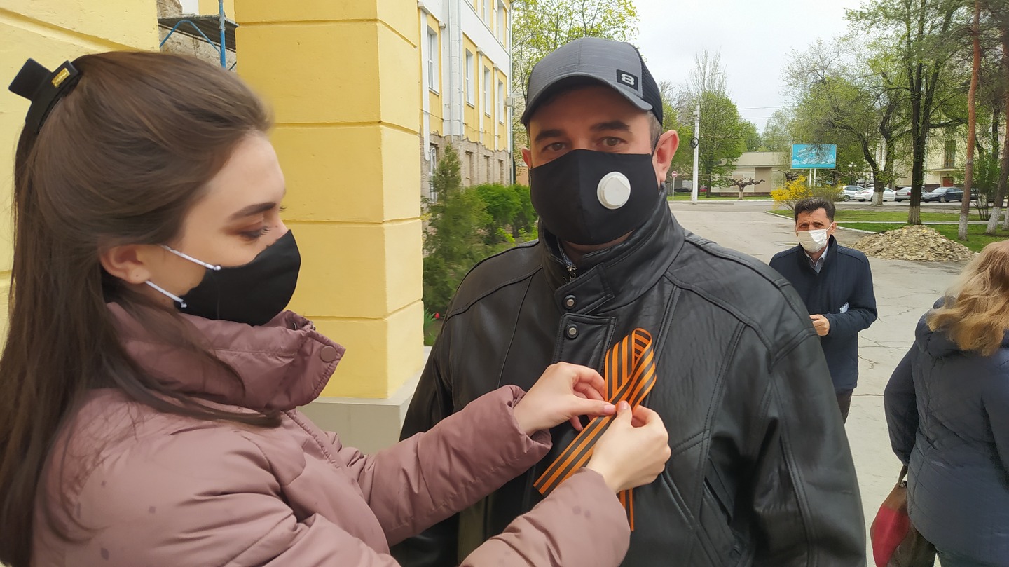 Каждому сотруднику и курсанту при входе на территорию вуза вручали чёрно-оранжевый символ Победы в Великой Отечественной войне.