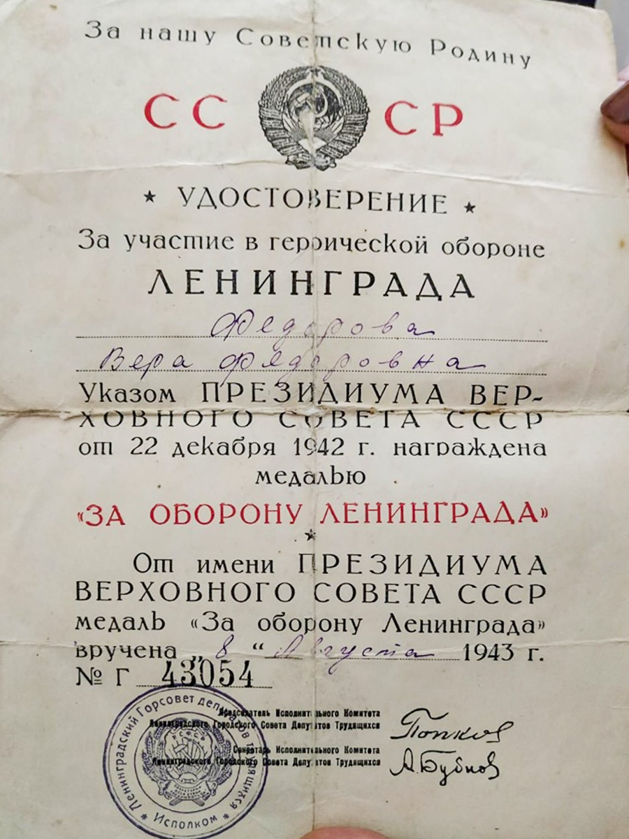 Первой гостей встречала тираспольчанка Вера Фёдоровна Фёдорова. Когда началась блокада, ей было всего 17 лет. На войне она была медсестрой 736-го полевого госпиталя, спасала жизни солдат и офицеров Красной армии. За мужество, стойкость и героизм она награждена орденом Отечественной войны, медалями «За боевые заслуги», «За оборону Ленинграда», «За победу над Германией». После войны она бывала в Санкт-Петербурге на мероприятиях, посвящённых снятию блокады Ленинграда, посещала святое место для всех ленинградцев – Пискаревское кладбище. Сегодня ей 96 лет. Благодаря стараниям родных и близких бывшая фронтовичка окружена заботой и любовью.