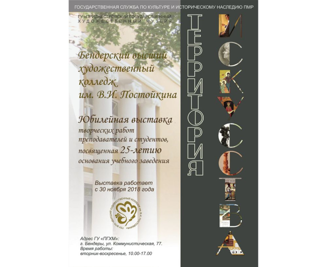 Бендеры, 27 ноября. /Новости Приднестровья/. 30 ноября в 15:00 в Приднестровском государственном художественном музее откроется «Территория искусства». Так называется выставка творческих работ преподавателей и студентов Бендерского высшего художественного колледжа им. В.И. Постойкина, посвященная 25-летнему юбилею образовательного учреждения.