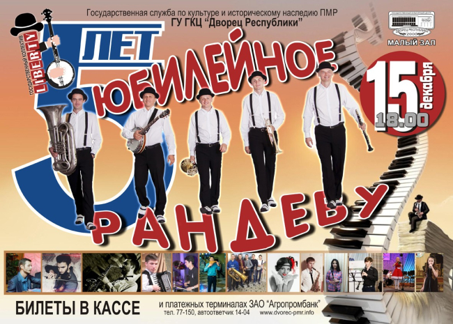 Тирасполь, 12 декабря. /Новости Приднестровья/. 15 декабря в малом зале Дворца Республики состоится большой концерт Государственного квинтета «Liberty» под названием «Юбилейное рандеву».