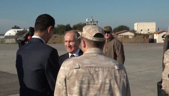 В Хмеймиме главу государства встретили президент Сирии Башар Асад, министр обороны Сергей Шойгу и командующий российской группировкой в Сирии Сергей Суровикин.