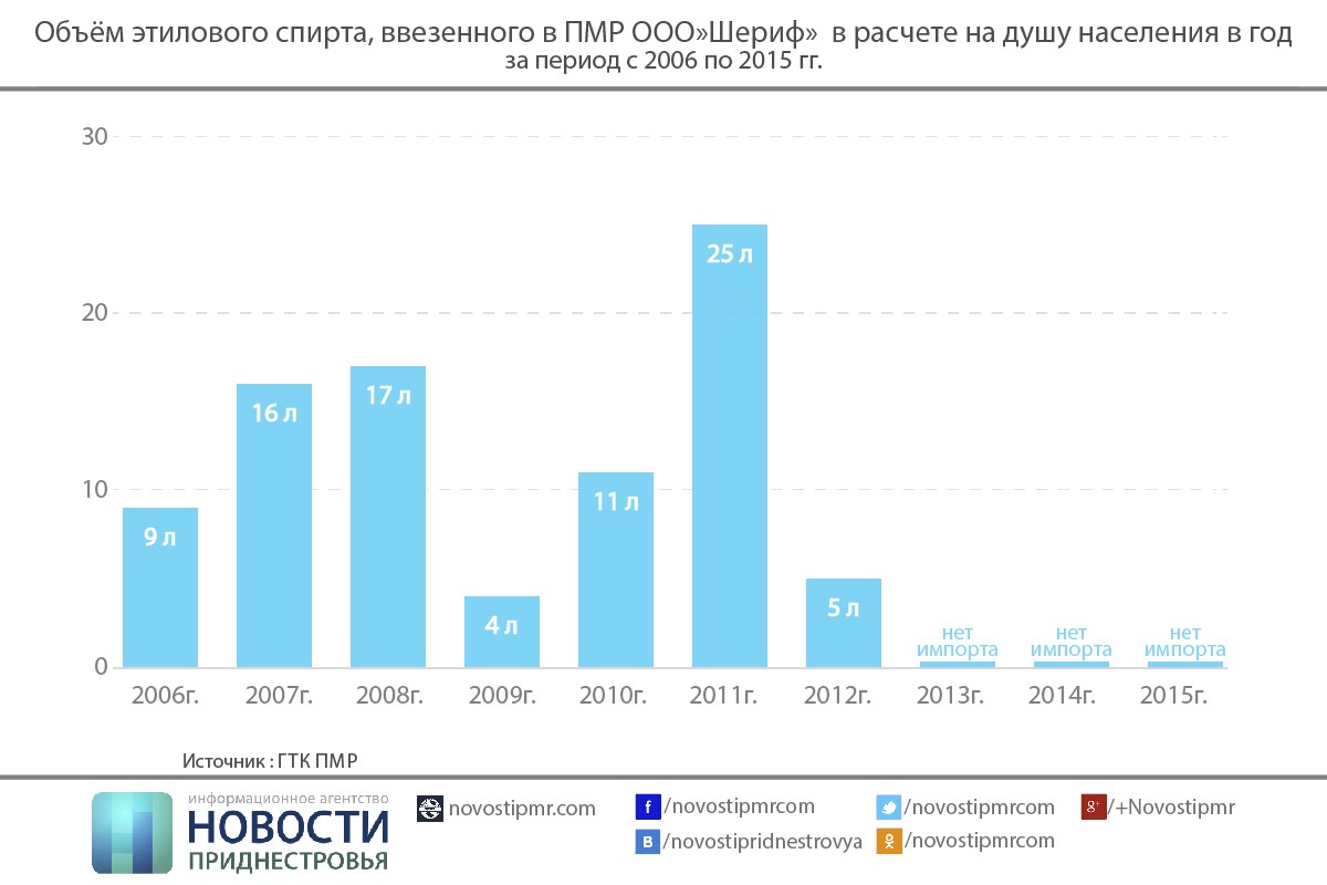 По данным статистики ГТК ПМР, с 2006 по 2011 годы количество товаров, ввезённых ООО «Шериф» в Приднестровье, значительно превышает среднестатистические нормы потребления населением. Например, в 2006 году, учитывая объёмы импортированного фирмой этилового спирта, на каждого жителя республики, в том числе младенцев, приходилось по 9,2 литра. В 2008 году уже по 16,9 литра, в 2011 – 24,7 литра. Если перевести этот спирт в алкогольную продукцию, объёмы приобретут показательные размеры. И это при том, что критическая норма потребления алкоголя в год на одного человека, по данным Всемирной организации здравоохранения, составляет 8 литров.