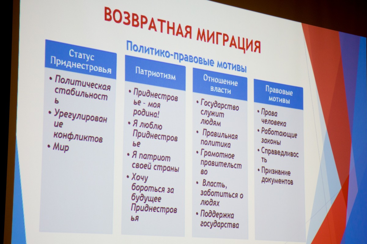 «Но поскольку миграция - это действительно большая проблема, важно понять, в чем ее феномен, почему из Приднестровья люди уезжают. Нам представляется, что одним из факторов, которые стимулируют миграцию, является такая неблагоприятная миграционно-психологическая среда. Это моменты, связанные с урегулированием конфликта, давлением со стороны внешних сил. Но если мы немного отойдем от информационного фона, то мы увидим, что ПМР – достаточно благополучное государство и у нас есть масса преимуществ перед другими государствами и ими нужно пользоваться. Но самый главный ресурс – это человеческий капитал и это те люди, которые уезжают. Поэтому нужно думать о том, что делать в государстве, чтобы люди хотели здесь оставаться», - подчеркнул Игорь Шорников.