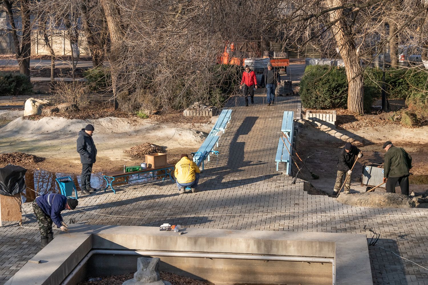 Территорию покрывают тротуарной плиткой. Монтируют систему освещения. В планах – организация локальных досуговых зон, открытие паркового кафе.