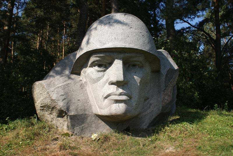 Скульптура воину-освободителю была установлена в 1985 году на месте одного из первых танковых сражений Великой Отечественной войны. В первоначальном виде она состояла из валунов, на которых были высечены лица двух воинов. В 90-е годы скульптуру взорвали вандалы и голова одного воина была сильно повреждена.