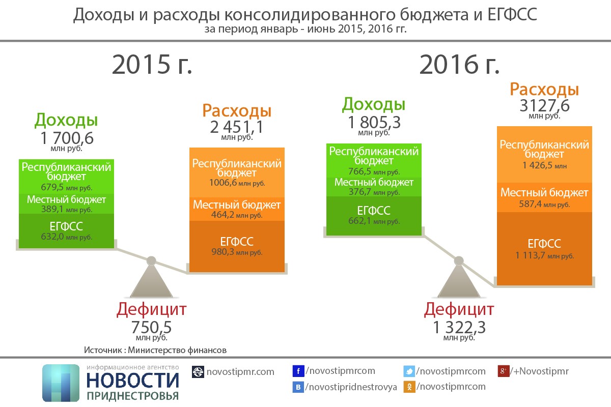 21 Июл.., 2016, 11:33Тирасполь, 21 июля. /ИА «Новости Приднестровья»/. В первом полугодии 2016 года, по сравнению с аналогичным периодом 2015, фактический дефицит консолидированного бюджета вырос практически вдвое. Согласно данным Министерства финансов, по итогам 6-ти месяцев 2015 года разница между поступившими в бюджет доходами и израсходованными средствами составляла 750,5 млн рублей, в первом полугодии 2016 эта цифра равняется уже 1 млрд 322,3 млн рублей.