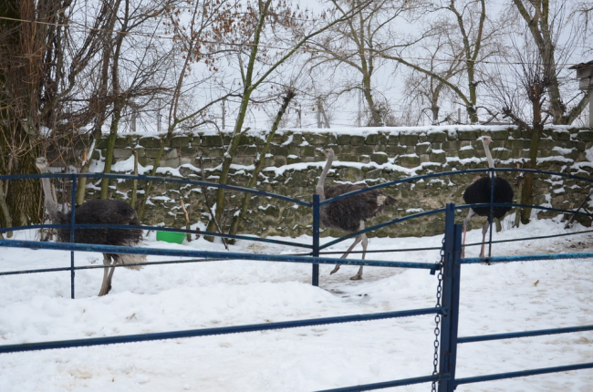 Выпавший снег и морозы особо не повлияли на работу питомника. Большая часть его обитателей нормально переносит низкие температуры. В их числе и африканские страусы. Страус Яша живет в зоопарке 15 лет, Маша – 13 лет, а их малышка – несколько лет.