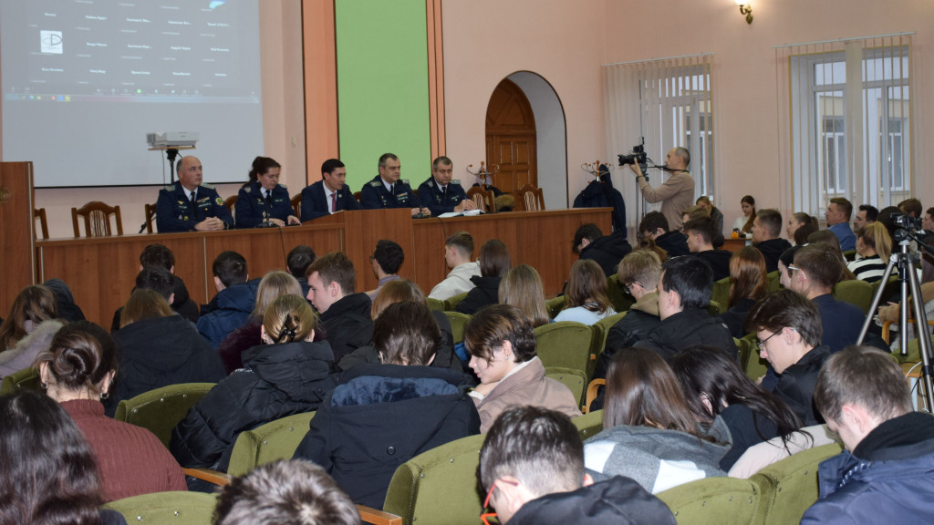Вниманию студентов был представлен презентационный видеоролик о деятельности таможенных органов Приднестровья. Молодые люди интересовались прохождением практики с перспективой дальнейшего трудоустройства, возможностью распределения после окончания вуза на службу в таможенные органы, спрашивали о качествах и навыках, которые дают преимущества при трудоустройстве, об испытательном сроке и присвоении первого специального звания.