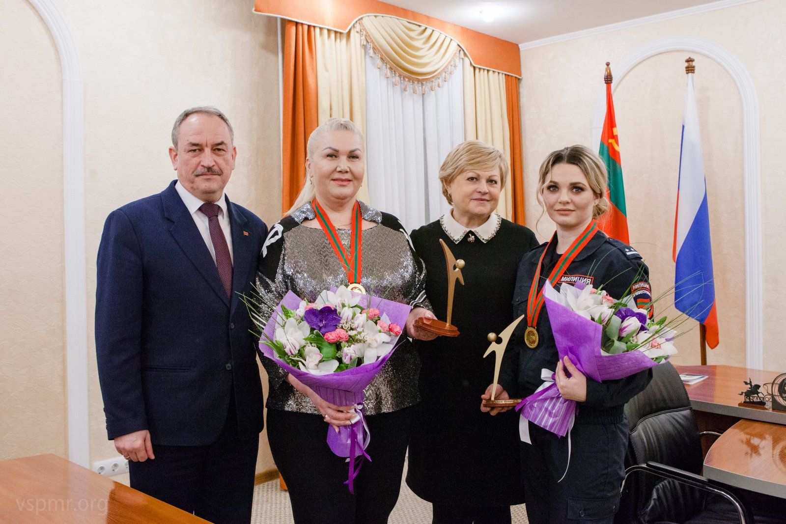 Тирасполь, 28 февраля. /Новости Приднестровья/. Волонтёры и добровольцы. С весны прошлого года эти слова произносятся так же часто, как «коронавирус», «карантин» и «пандемия». 2020-й год прошел в Приднестровье, как и во всем мире, под знаком COVID-19. Волонтеры и добровольцы для всех стали примером человеколюбия, доброты и готовности прийти на помощь в любую минуту. Эти две номинации государственного конкурса «Человек года – 2020» можно выделить особо. Вручение государственных премий в этом году состоялось по-карантинному: не в большом зале Дворца Республики, а точечно, по отдельности. Торжественная церемония награждения победителей номинаций «Доброволец года» и «Волонтер года» Елены Константиновой и Татьяны Зиновьевой состоялась в здании приднестровского парламента. Статуэтки и почетные дипломы им вручили председатель Верховного Совета ПМР Александр Коршунов и вице-спикер Галина Антюфеева, сообщает парламентская пресс-служба.