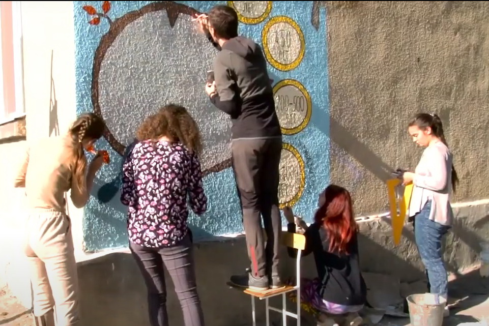 Рыбницкие волонтёры разукрасили стену сельской школы эко-граффити