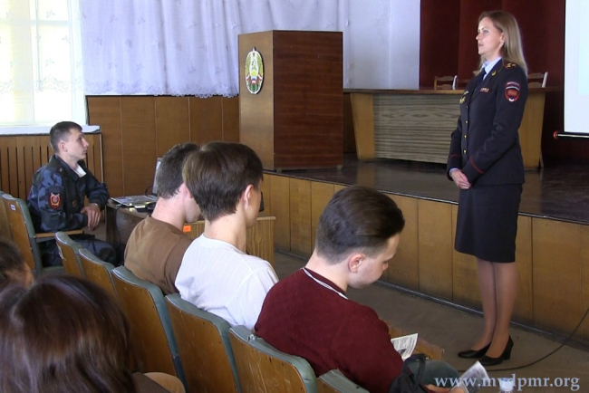 Рыбница, 23 октября. /Новости Приднестровья/. Представители Тираспольского юридического института МВД ПМР им. М.И. Кутузова провели встречу со старшеклассниками рыбницких школ. Заместитель начальника ТЮИ по работе с личным составом и кадрами полковник милиции Наталья Левинская рассказала ребятам о профессии юриста.