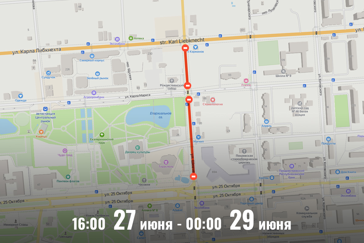 Тирасполь, 25 июня. /Новости Приднестровья/. В Тирасполе с 16:00 27 июня до 00:00 29 июня будет осуществлено полное перекрытие движения автотранспорта по улице Шевченко на участках от улицы Карла Либкненхта до улицы Карла Маркса и от улицы Карла Маркса до улицы 25 Октября.