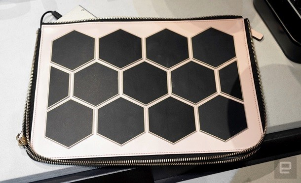 Кроме этого, компания показала специальный клатч со встроенными шестиугольными солнечными батареями. Новинка способна подзаряжать имеющиеся у владельца гаджеты в светлое время суток. Внутри клатча размещен разъем для micro-USB.