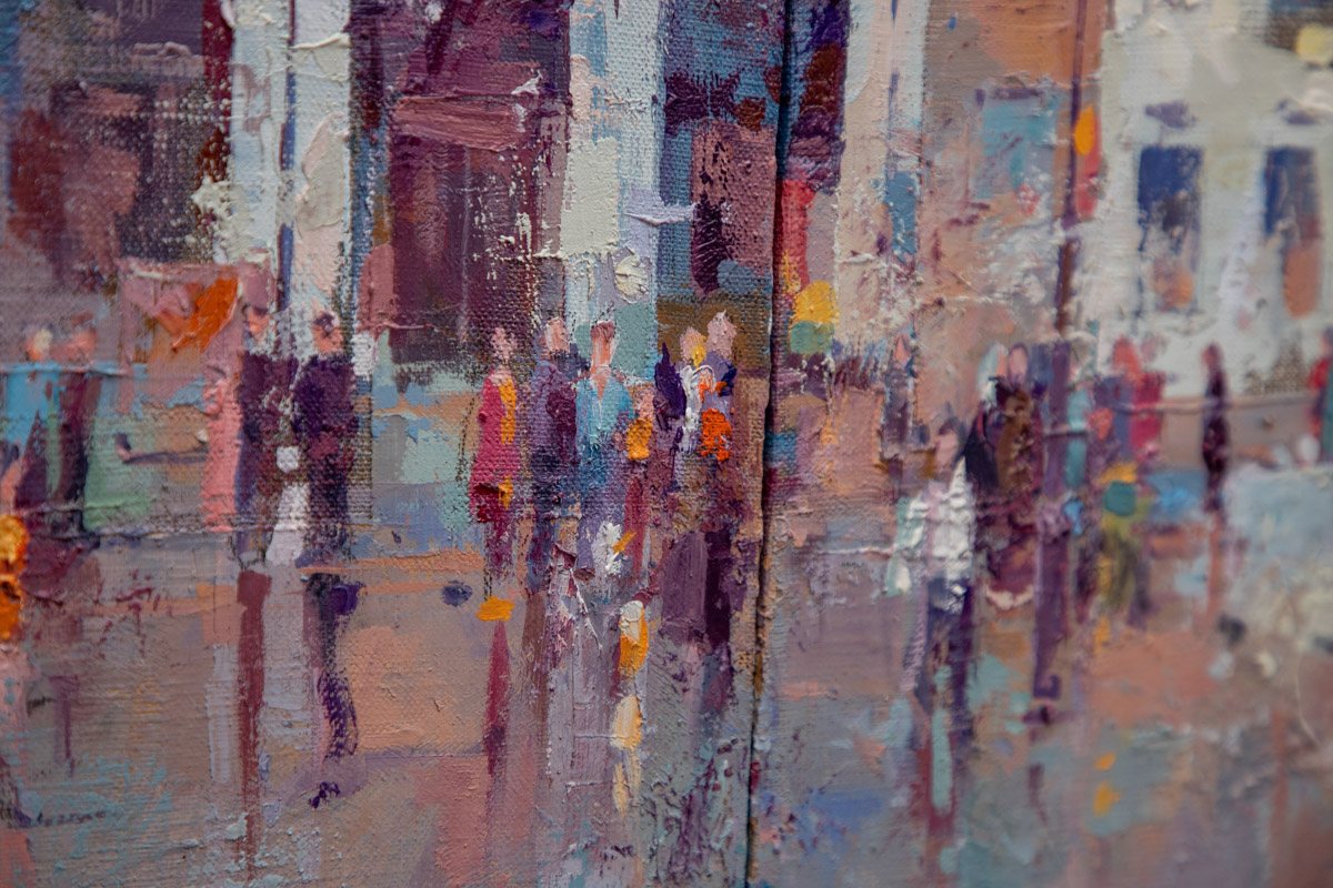«Ночной город. Пятница» была написана в докарантинный период. Художник вспоминает, что на её создание его вдохновили люди, которые по вечерам посещали кафе, гуляли по улицам, ходили по магазинам, куда-то спешили.