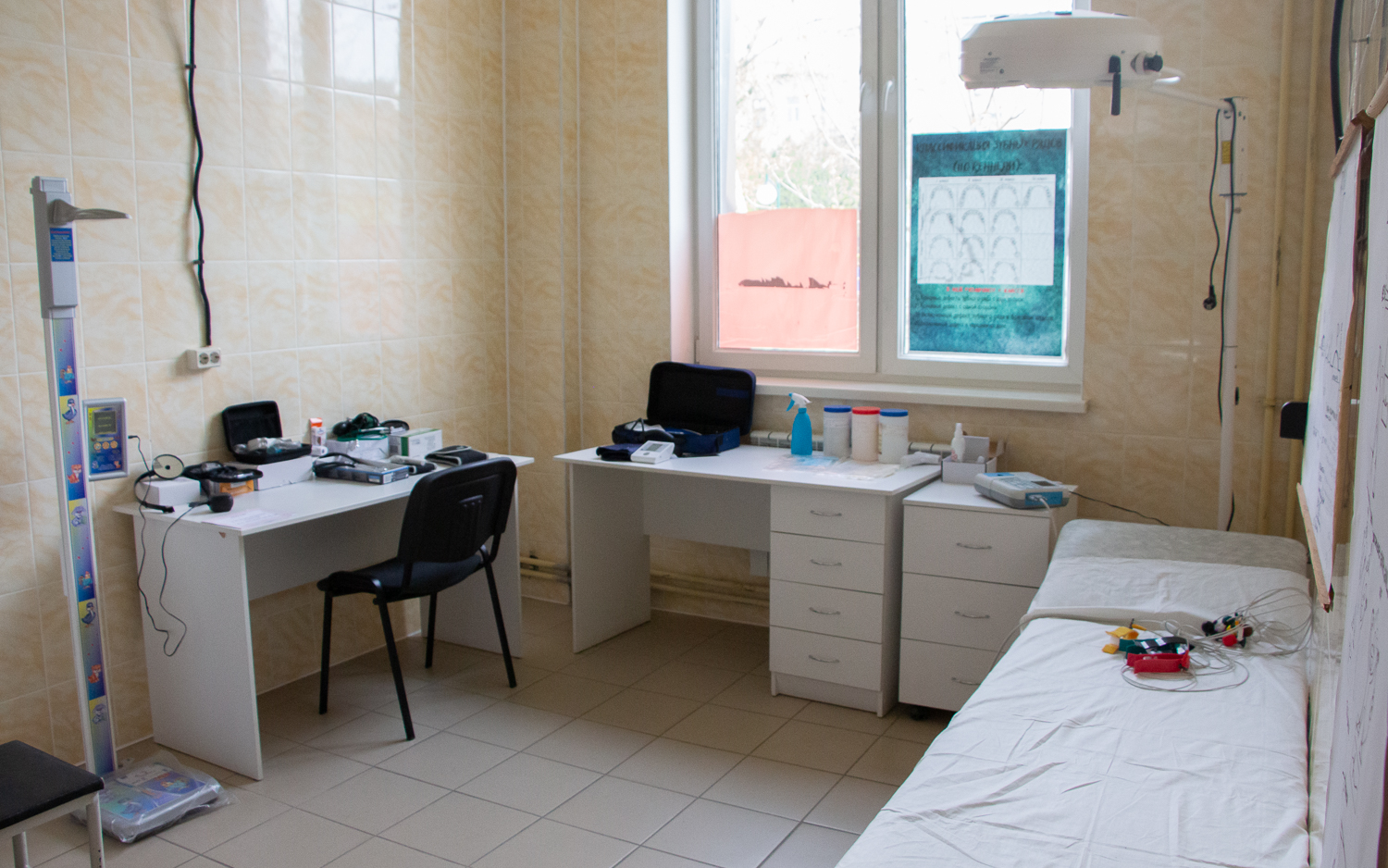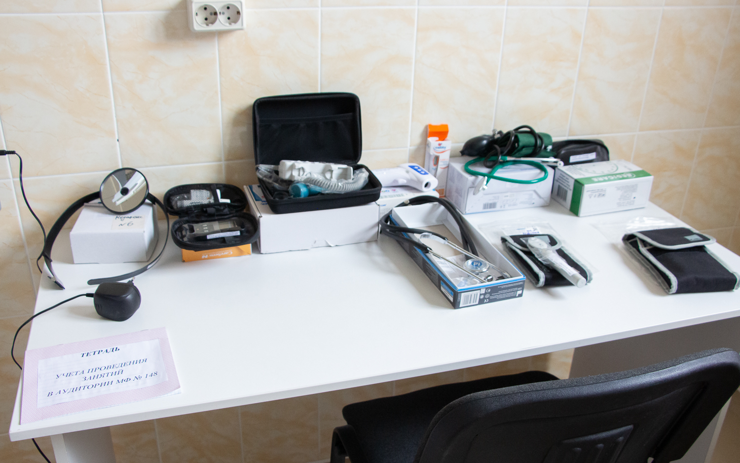 В кабинете есть тонометр и фонендоскоп для осмотра сердечно-сосудистой и дыхательной систем, различные виды термометров, глюкометр для определения сахара в крови. Студенты могут воспользоваться отоскопом и офтальмоскопом для исследований органов слуха и глазного дна. В классе имеется и кардиограф, на котором учащиеся отрабатывают навыки по записи и расшифровке кардиограммы.