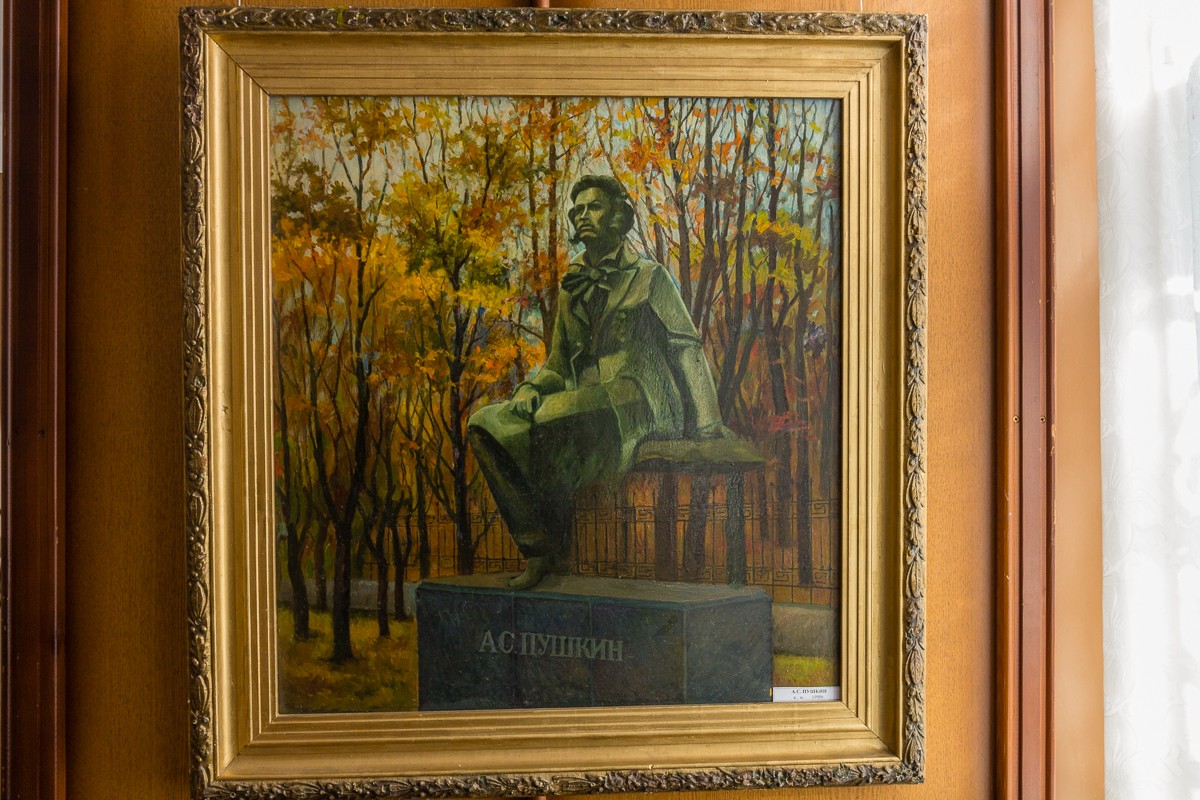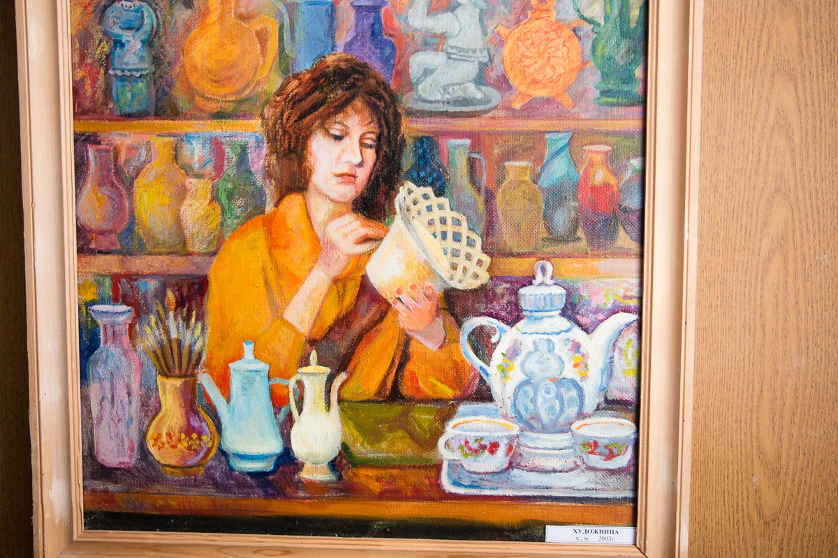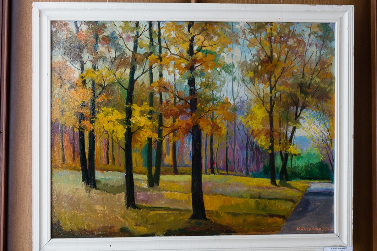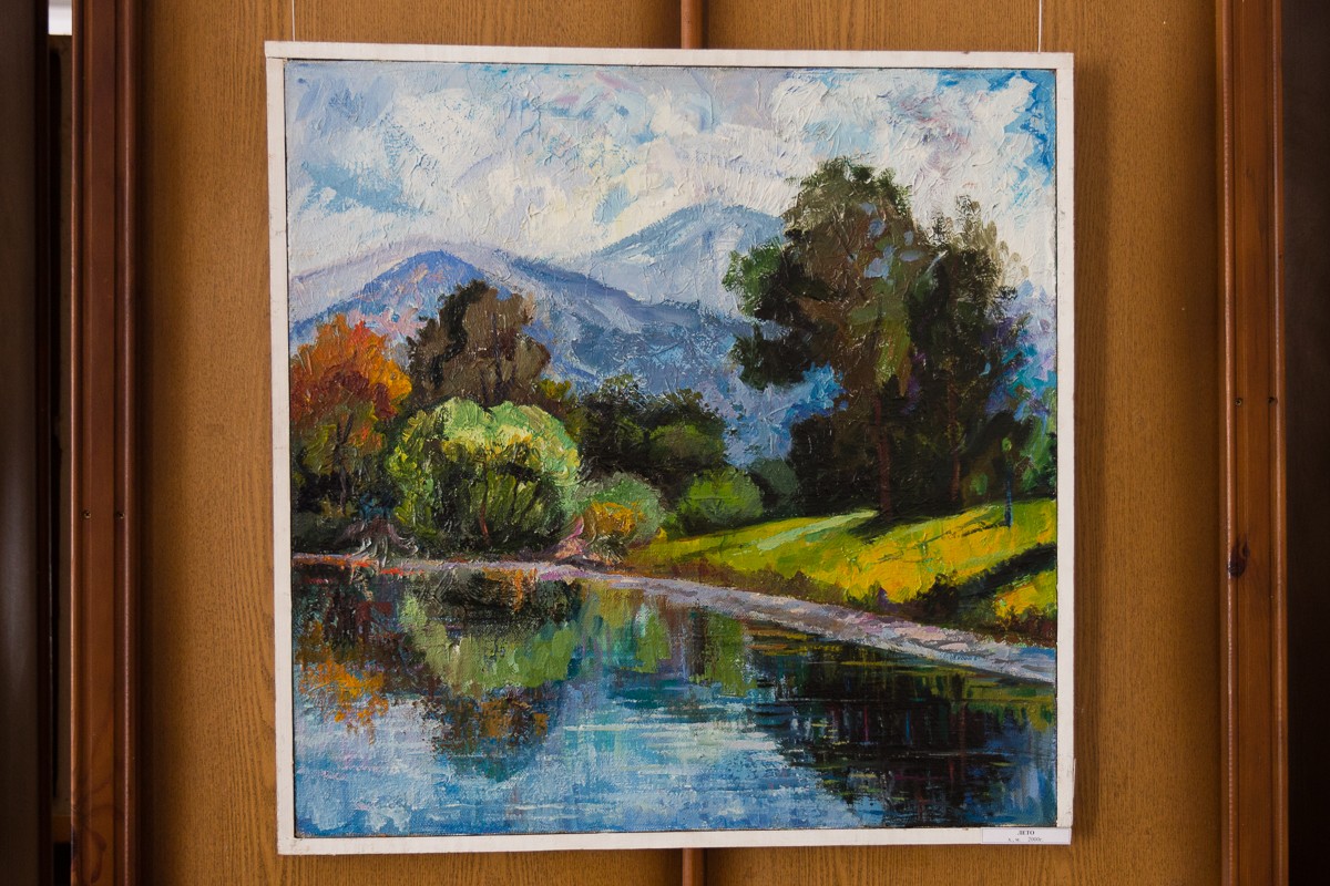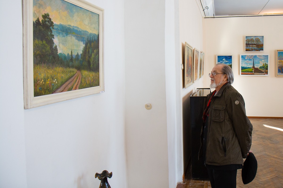 В почти полусотне картин — натюрморты, портреты, тематические композиции, но больше всего пейзажей. Как говорит супруга, последние — родом из детства.