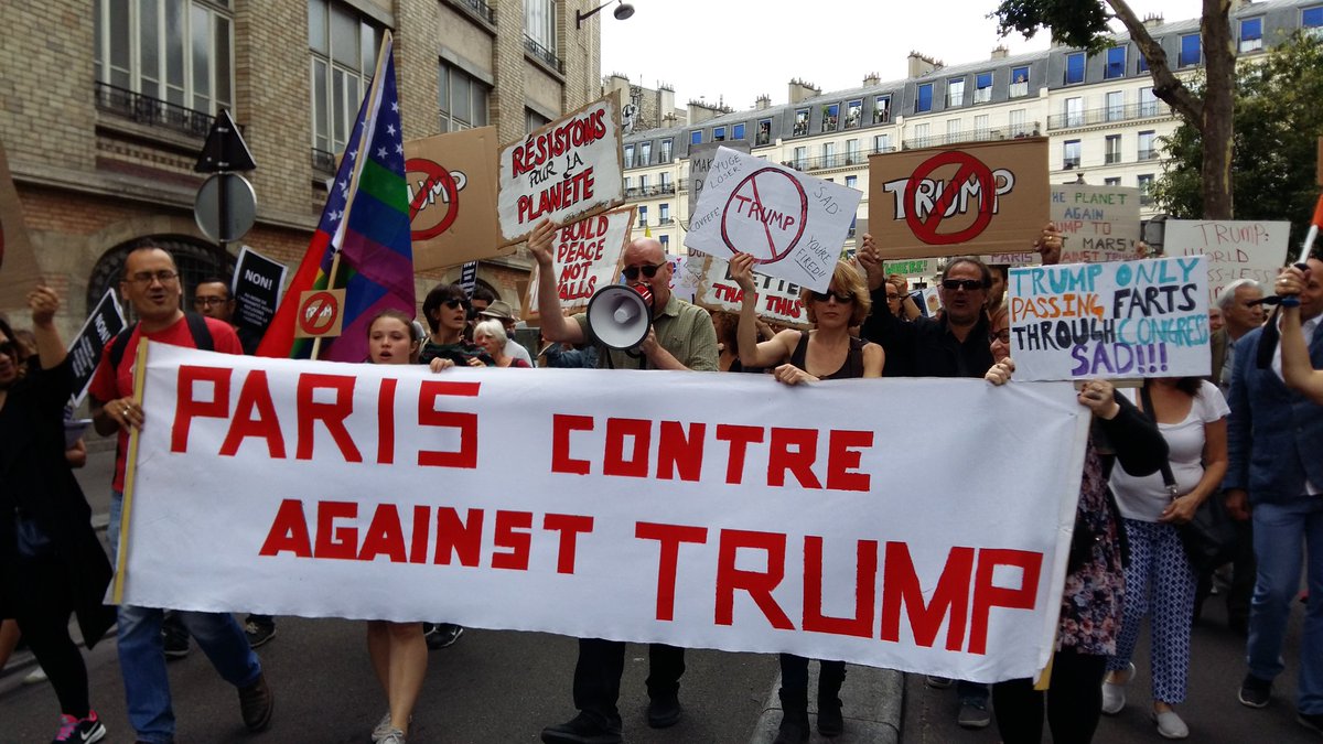 Люди несут плакаты с перечёркнутым именем американского лидера. Ещё одним поводом для недовольства французов являются социальные реформы, предлагаемые президентом страны Эммануэлем Макроном.