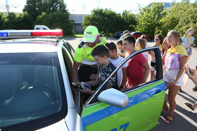 Подросткам показали оснащение патрульного автомобиля Дорожно-патрульной службы, рассказали для чего нужен громкоговоритель, видеорегистратор, как включаются спецсигналы.