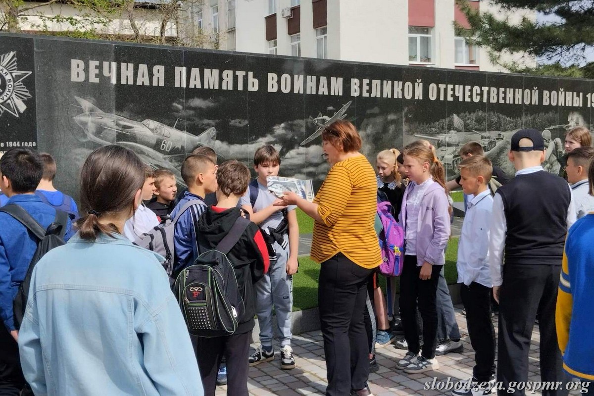 В преддверии праздника работники музеев Слободзейского музейного объединения провели для школьников пешие экскурсии по памятным местам. Представители Слободзейского исторического музея рассказали учащимся 5 классов городской школы № 1 о мемориальном комплексе воинской Славы. Ребята узнали об истории памятника, о воинах-земляках, погибших во время Великой Отечественной войны, воинах, освобождавших Слободзею в 1944 году, о погибших защитниках ПМР и воинах-интернационалистах.