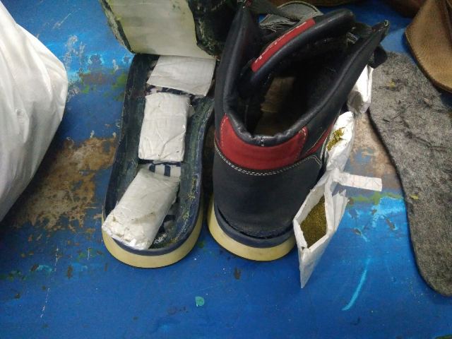 Шесть свёртков из бумаги были спрятаны в подошве пары зимних ботинок. Каждый из них содержал серо-зеленную массу растительного происхождения, напоминающую марихуану.