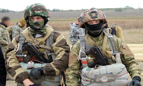 Перед посадкой в самолёт бойцы спецподразделения проверили друг у друга подгонку снаряжения и крепление оружия. Прыжки спецназовцы МГБ выполняли с полной боевой выкладкой.