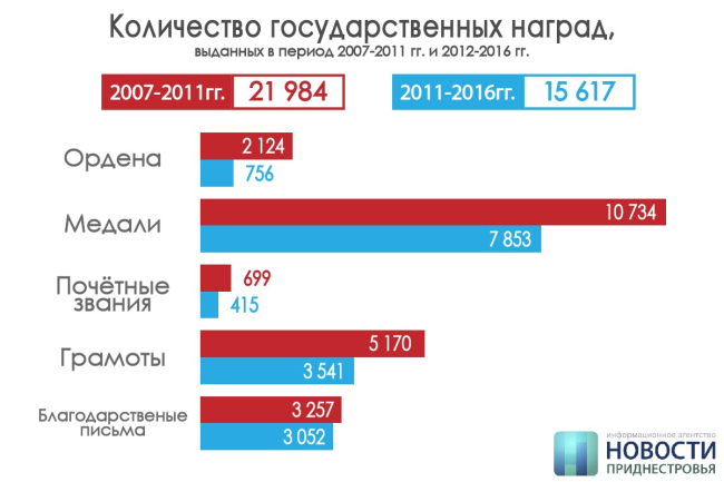 Существенно сократилось и количество награждений медалями: 10 734 медалей в 2007-2011 годах, и 7 853 – в 2012-2016 годах., из которых 5570 это медали «25 лет ПМР (2500 медалей были вручены в прошлом году участникам парада 2-го сентября).