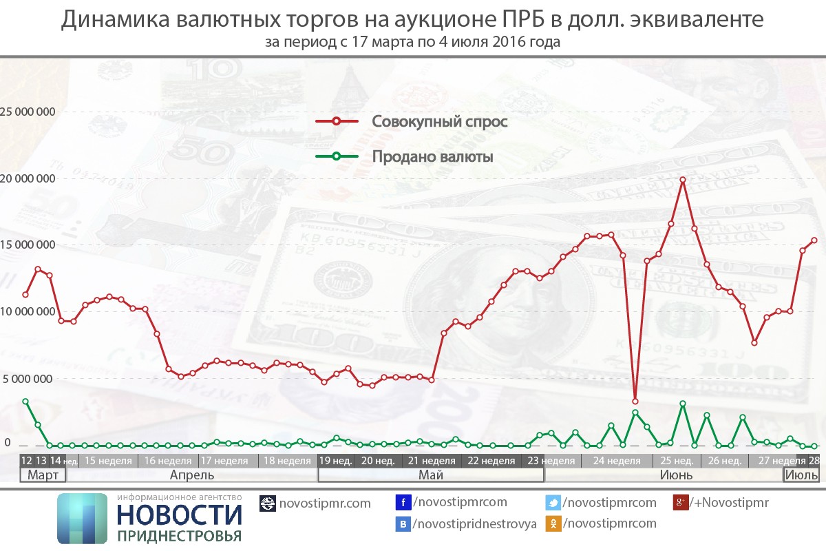 06 Июл.., 2016, 16:06Тирасполь, 5 июля. /ИА «Новости Приднестровья»/. С марта 2016 года в Приднестровье складывается непростая ситуация на внутреннем валютном рынке. Спрос на иностранную валюту устойчиво превышает предложение. ИА «Новости Приднестровья» проследило динамику торгов на валютном аукционе Центробанка за период с 17 марта по 4 июля.