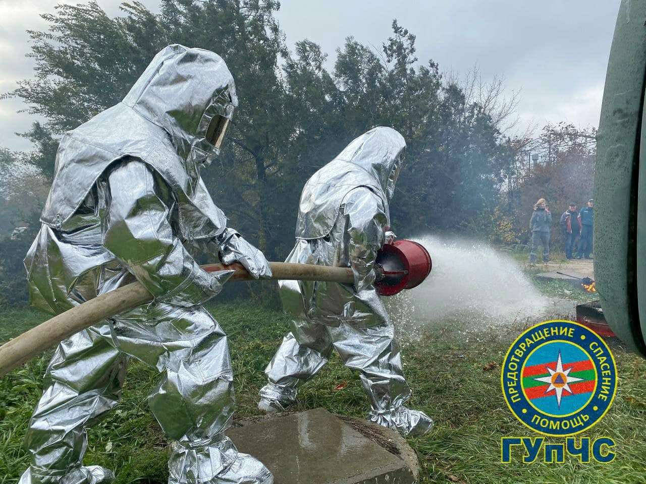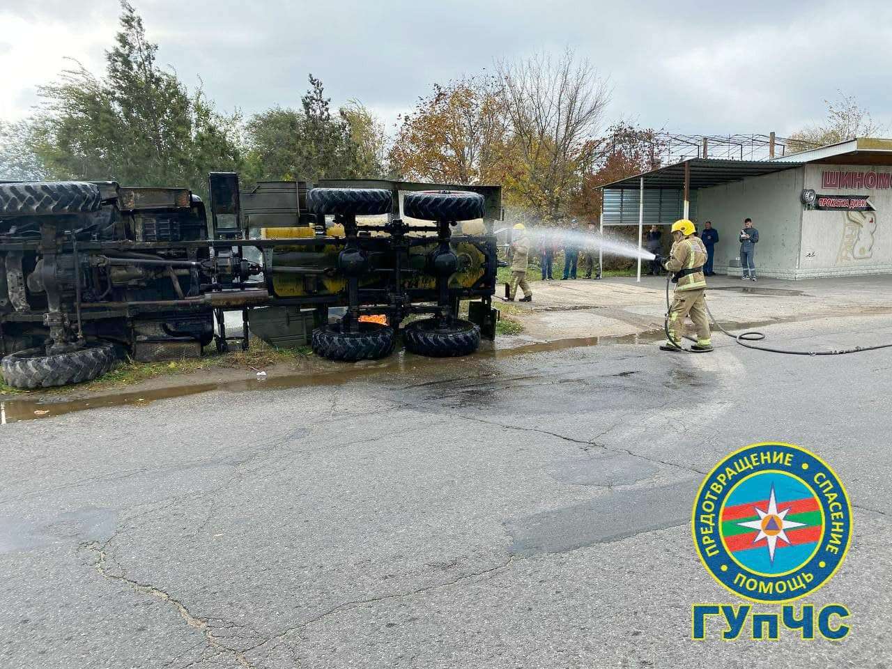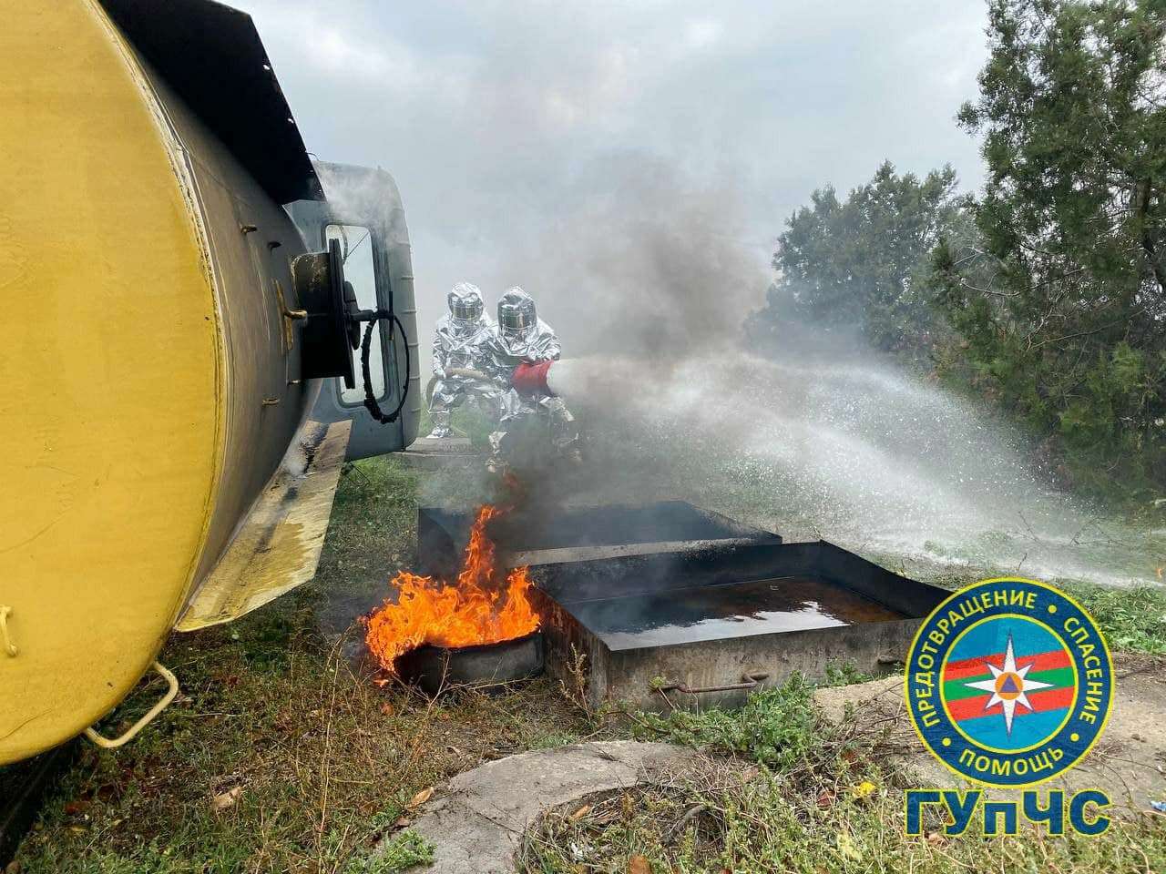 После всего с помощью подъёмного крана поставили на колёса автоцистерну и отбуксировали. Задача учений была успешно выполнена.