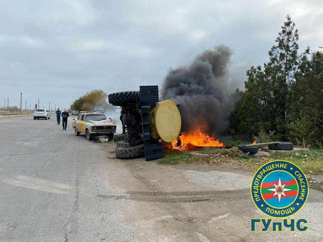 Столкнулись легковушка и автоцистерна с топливом. Цистерна перевернулась, её содержимое загорелось. Тем временем пассажир «Москвича» оказался заблокирован в салоне, а из-под капота повалил дым, сообщил пресс-центр МВД.