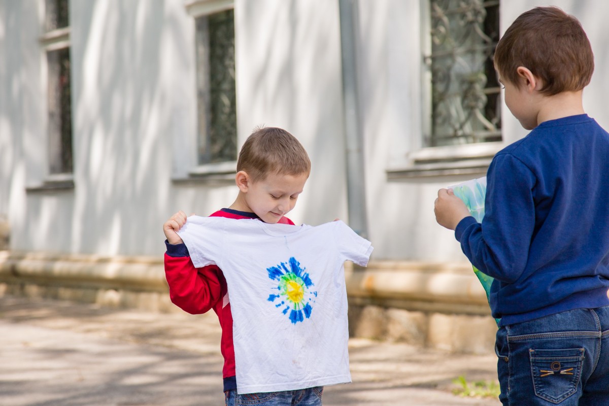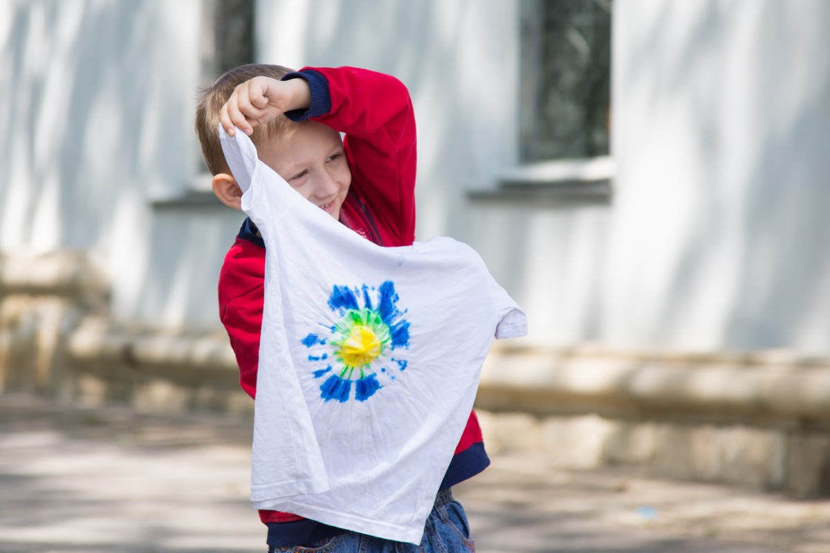 Техника батика - это художественная роспись красками по ткани. Обычно её делают по шёлку, но с учётом сложности этого искусства и возраста малышей за основу взяли заранее подготовленные вещи. На каждой из них завязали несколько узелков, окрасили в разные цвета, подсушили, и вот к искреннему восторгу юных художников персональное произведение искусства готово.