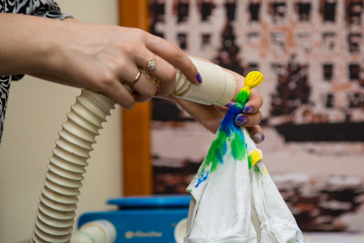 «Узелковый батик — это такая более экспериментальная техника, потому что в принципе результат неизвестен и одинаковых изделий никогда не получится — её невозможно повторить. Мы подобрали такие цвета, которые можно соединять друг с другом, чтобы получились хорошие сочетания, такая техника обеспечивает плавный переход одного цвета в другой, и у каждого получается свой узор, свой рисунок», — поясняет Людмила Мирончук.