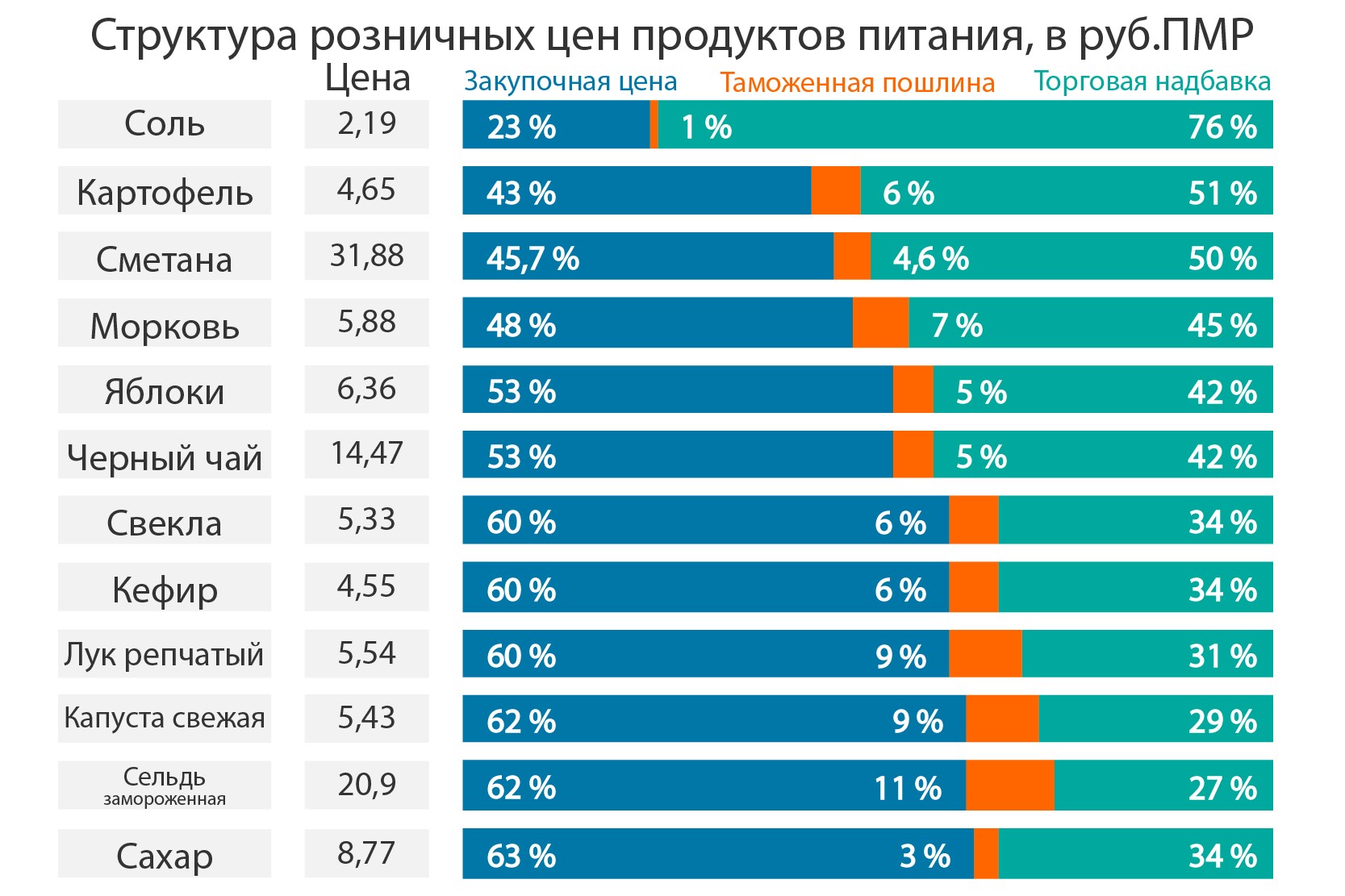 Специалисты Государственного таможенного комитета провели анализ розничных цен в республике и выяснили, что величина торговой надбавки по ряду продовольственных товаров зачастую превосходит их закупочные цены, при том, что таможенные пошлины на эти товары остаются минимальными