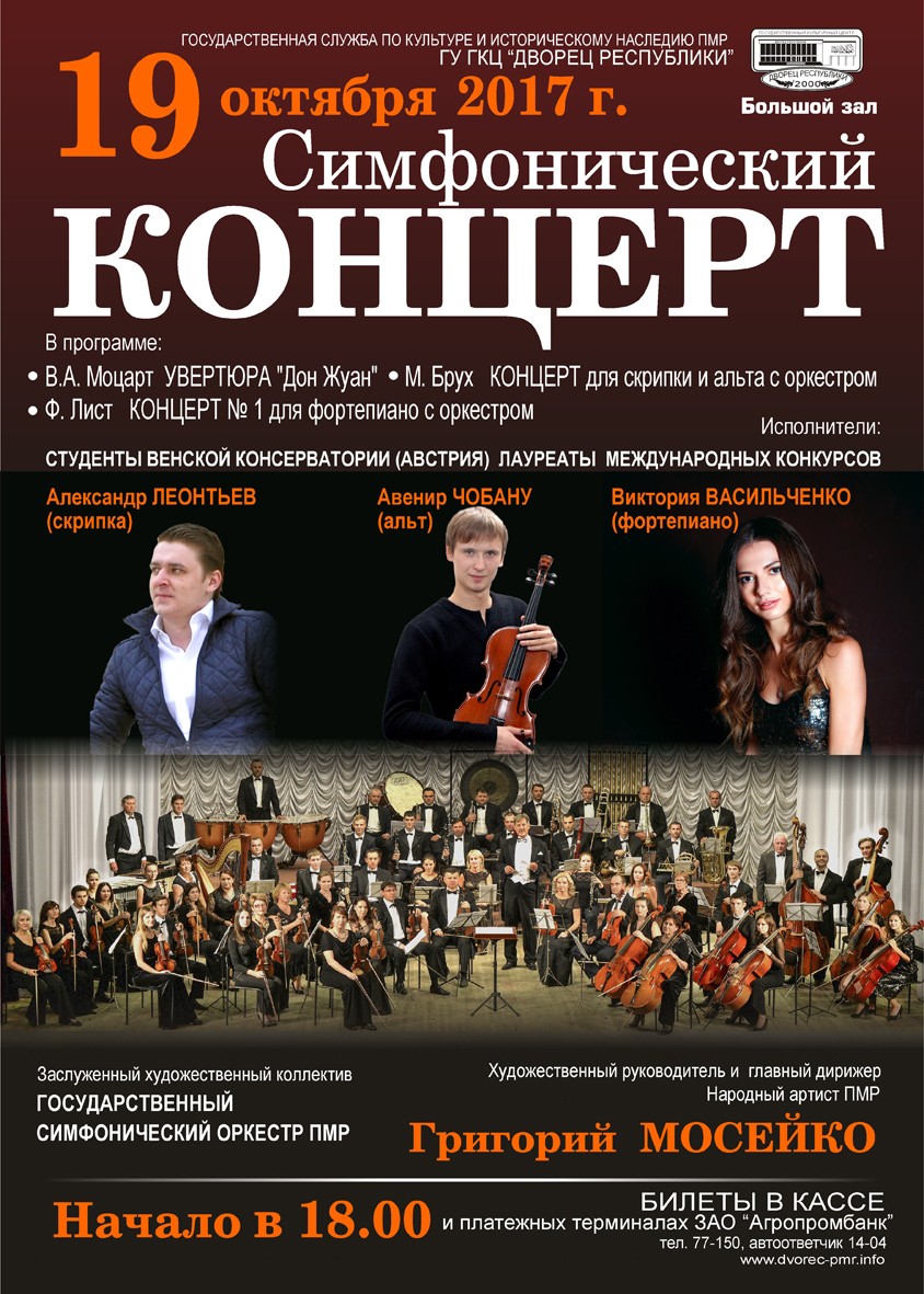 Приднестровскому симфоническому оркестру будут солировать скрипка – Александр Леонтьев, альт – Авенир Чобану и фортепиано – Виктория Васильченко.
