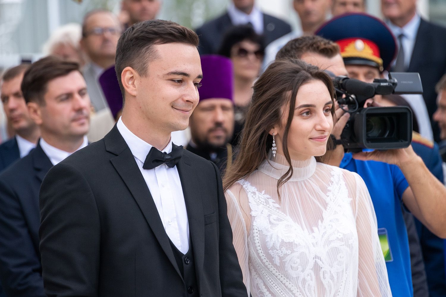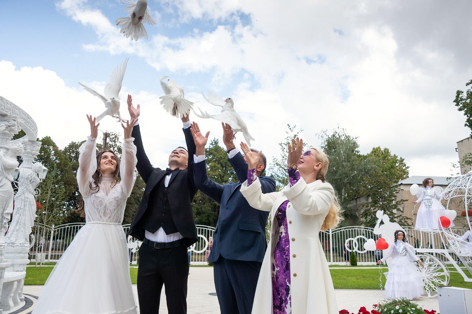 На церемонии супруги с тридцатилетним стажем Вадим и Светлана Красносельские и молодожены Григорий и Юлия Калинины выпустили в небо белых голубей, символизирующих семейное счастье.